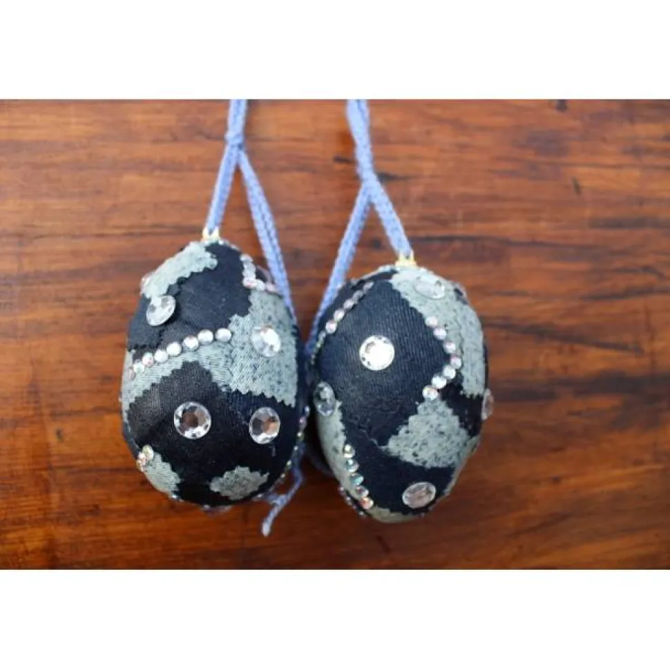 Mit Jeansstoff umkleidete Styroporeier, verziert mit Glitzersteinen.