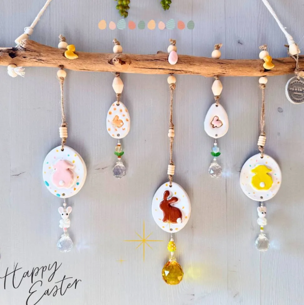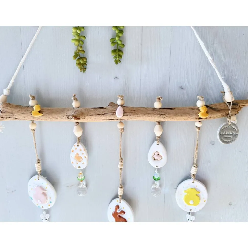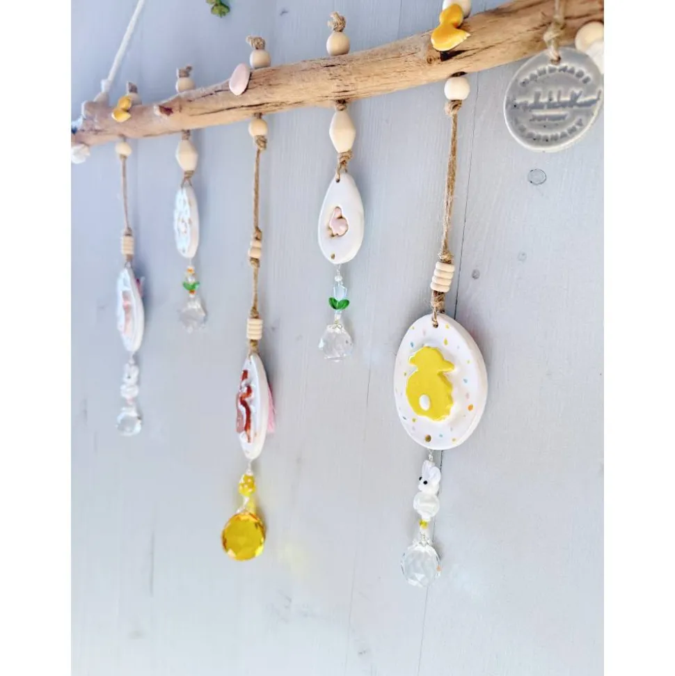 Ich kann es kaum erwarten, dir meinen selbstgemachten Deko Treibholzast vorzustellen! Ich habe ihn mit fünf handgefertigten, super süßen österlichen Keramikanhängern geschmückt, die ich selbst designt, hergestellt und gebrannt habe. Jeder Anhänger ist mit frühlingshaften Perlen und funkelnden Sonnenfänger-Kristallen verziert – einfach zauberhaft!