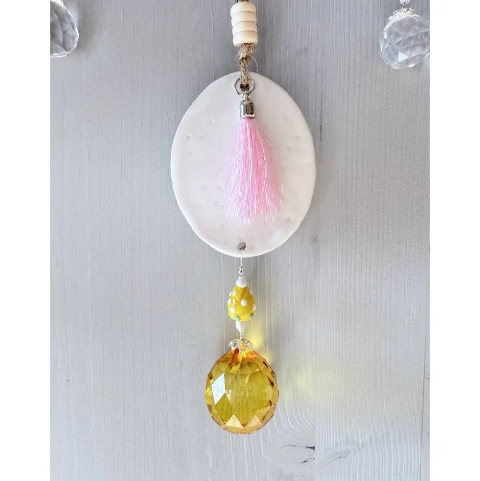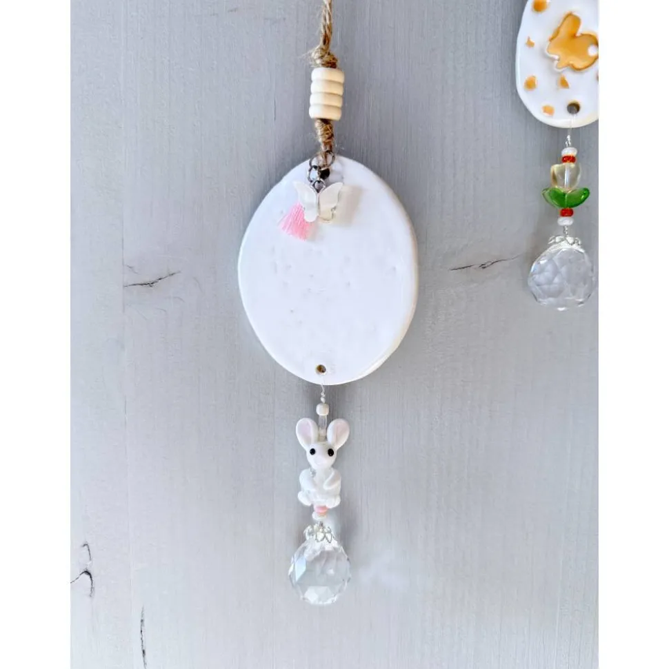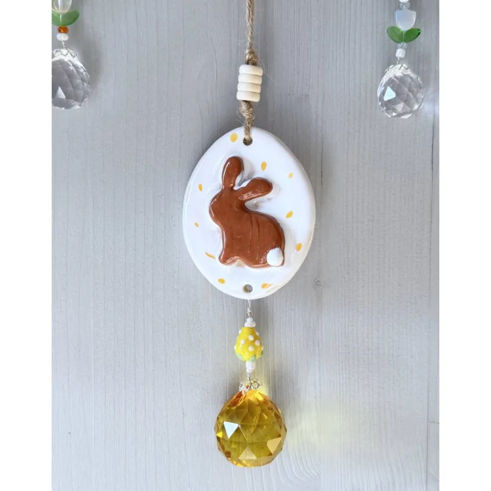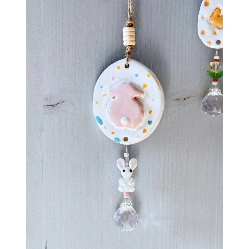 Ich kann es kaum erwarten, dir meinen selbstgemachten Deko Treibholzast vorzustellen! Ich habe ihn mit fünf handgefertigten, super süßen österlichen Keramikanhängern geschmückt, die ich selbst designt, hergestellt und gebrannt habe. Jeder Anhänger ist mit frühlingshaften Perlen und funkelnden Sonnenfänger-Kristallen verziert – einfach zauberhaft!