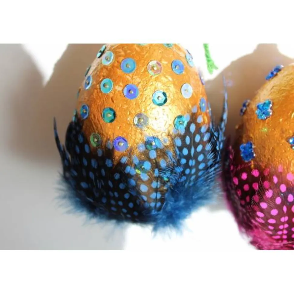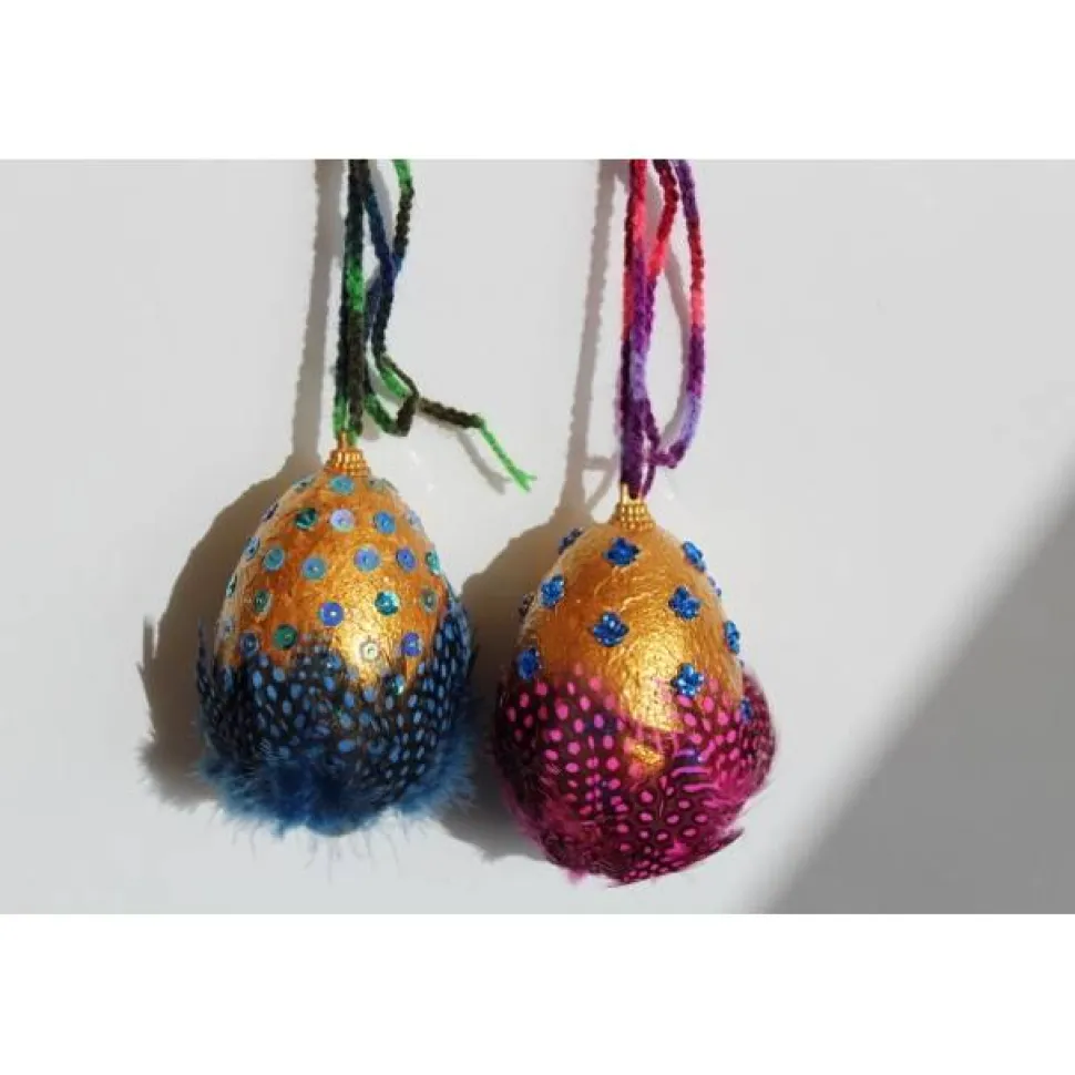 Mit goldener Acrylfarbe bemalte Styroporeier, verziert mit Federn, Pailetten und Glitzersteinen. 1 x in Pink und 1 x in Blau gehalten.