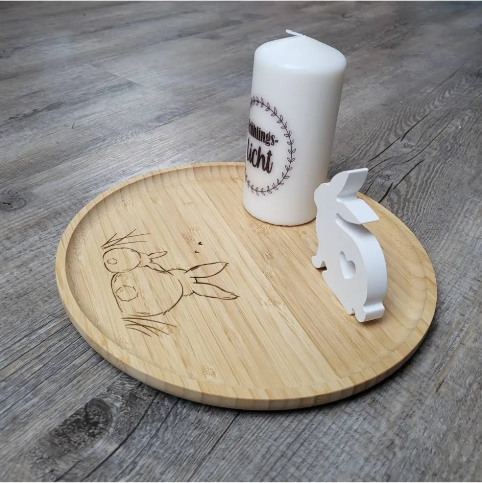 Diese Deko besteht aus einem gravierten Bambusteller, einer beschrifteten Stumpenkerze und einem gegossenem Osterhäschen.