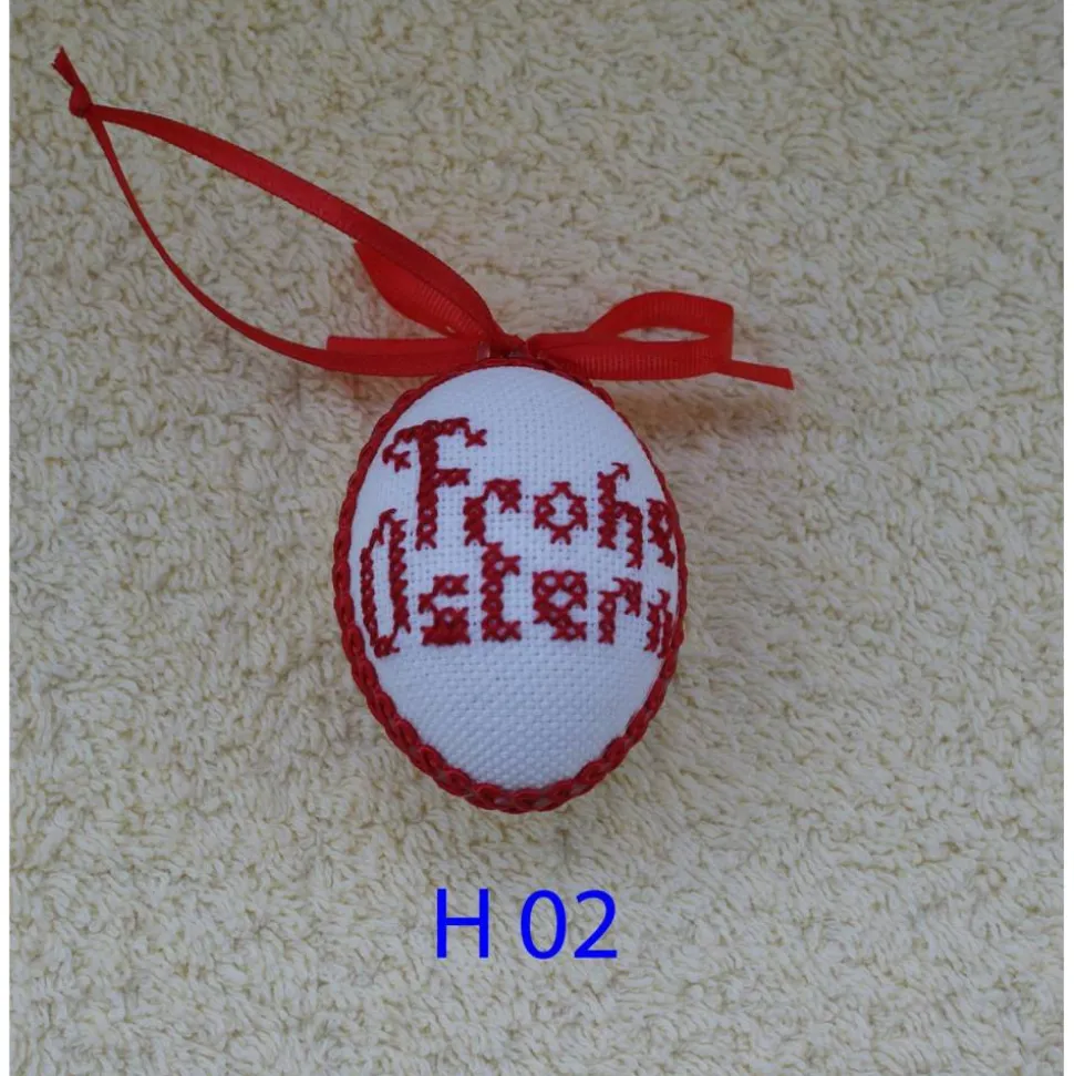 Das Ei ist beidseitig mit verschiedenen Motiven, in Kreuzstich, bestickt und mit Schleife und Schlingenborte verziert.