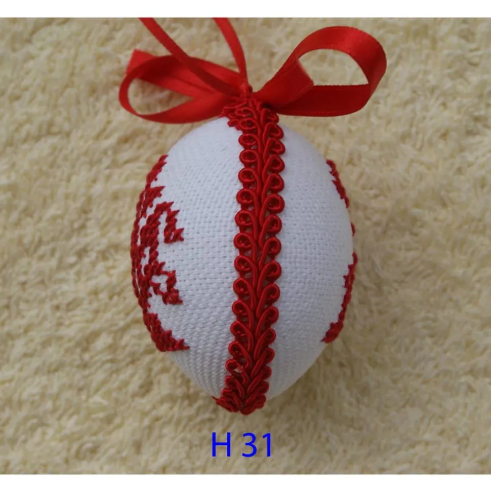Das Ei ist beidseitig mit verschiedenen Motiven, in Kreuzstich, bestickt und mit Schleife und Schlingenborte verziert.