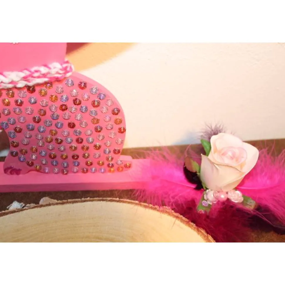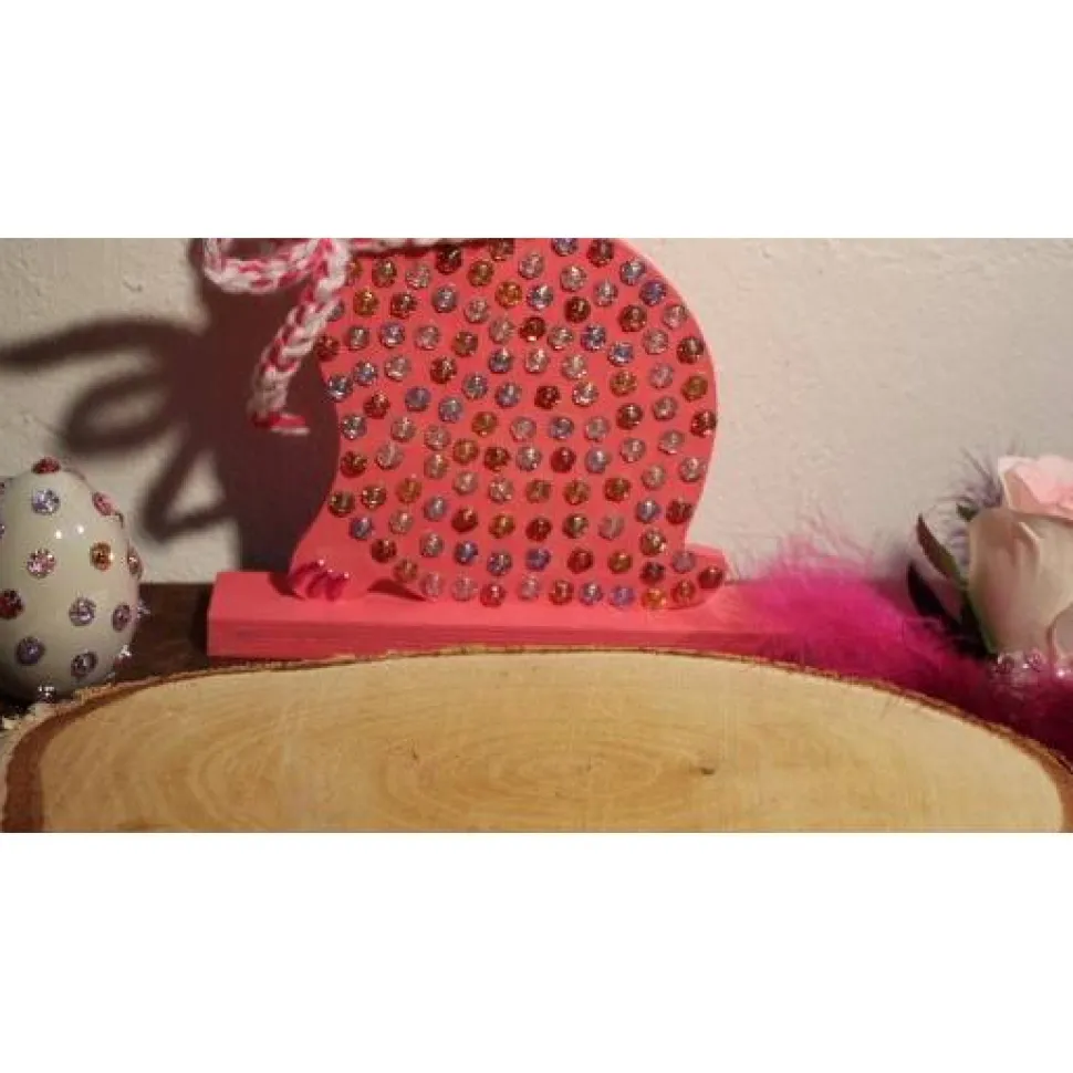 Ein Holzhase auf einer Baumscheibe mit Acrylfarben bemalt und mit unzähligen Glitzersteinen in Rosenform beklebt, mit einem gehäkelten Schleifchen verziert.