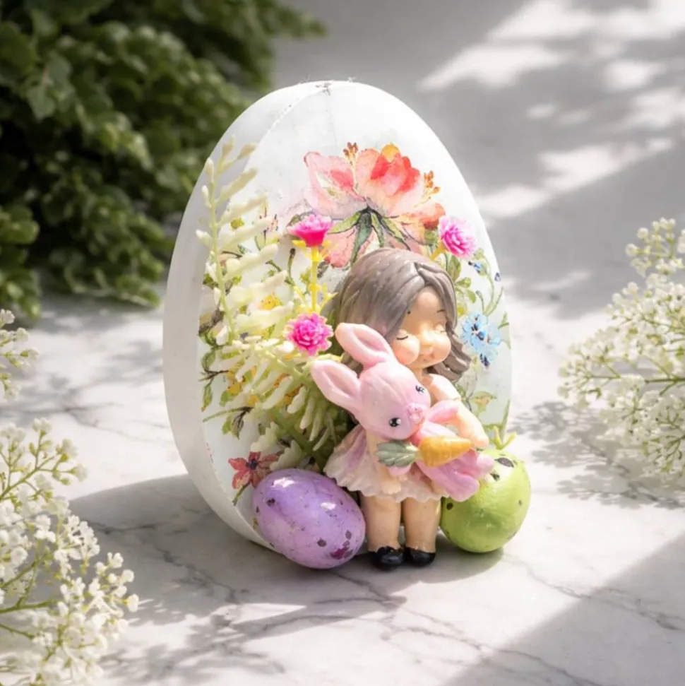Das Osterei wurde aus Xyrarock gemacht und die Verzierung ist aus Kaltporzellan in Handarbeit modelliert