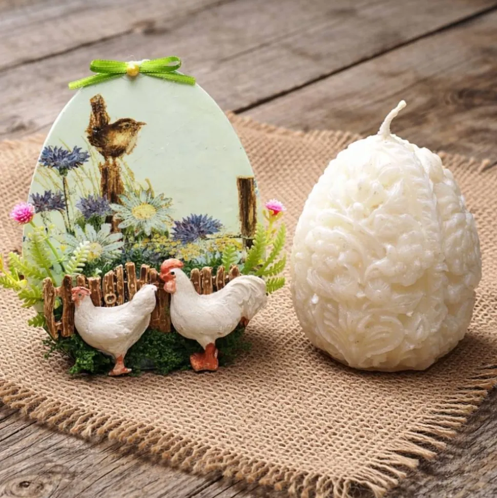 Kerze und ein Osterei mit aufwendiger handgemachter Verzierung.