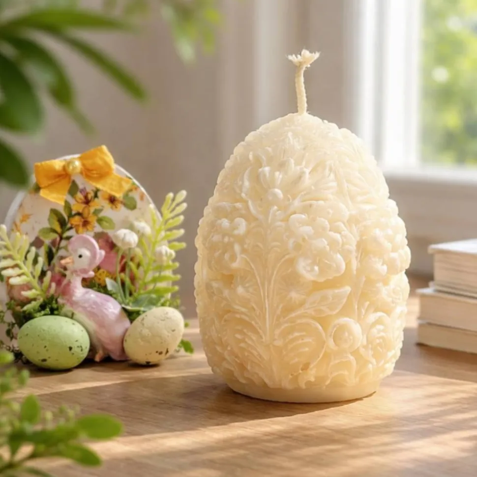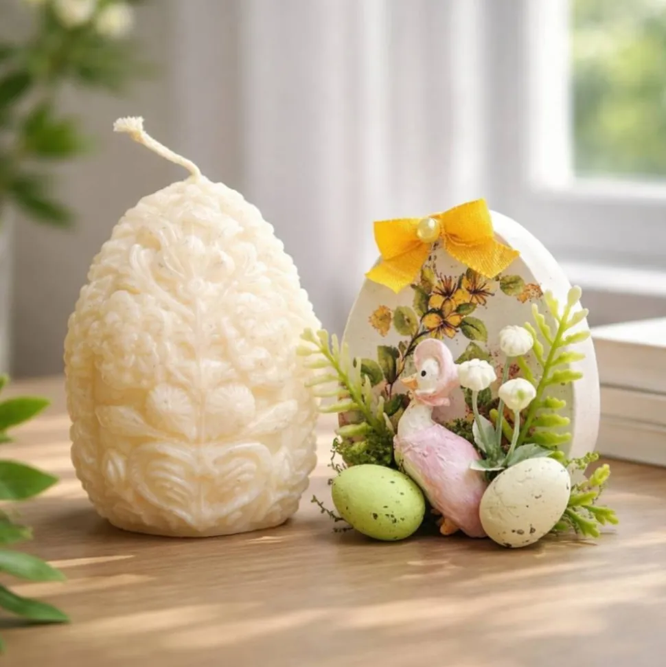 Kerze und ein Osterei mit aufwendiger handgemachter Verzierung.