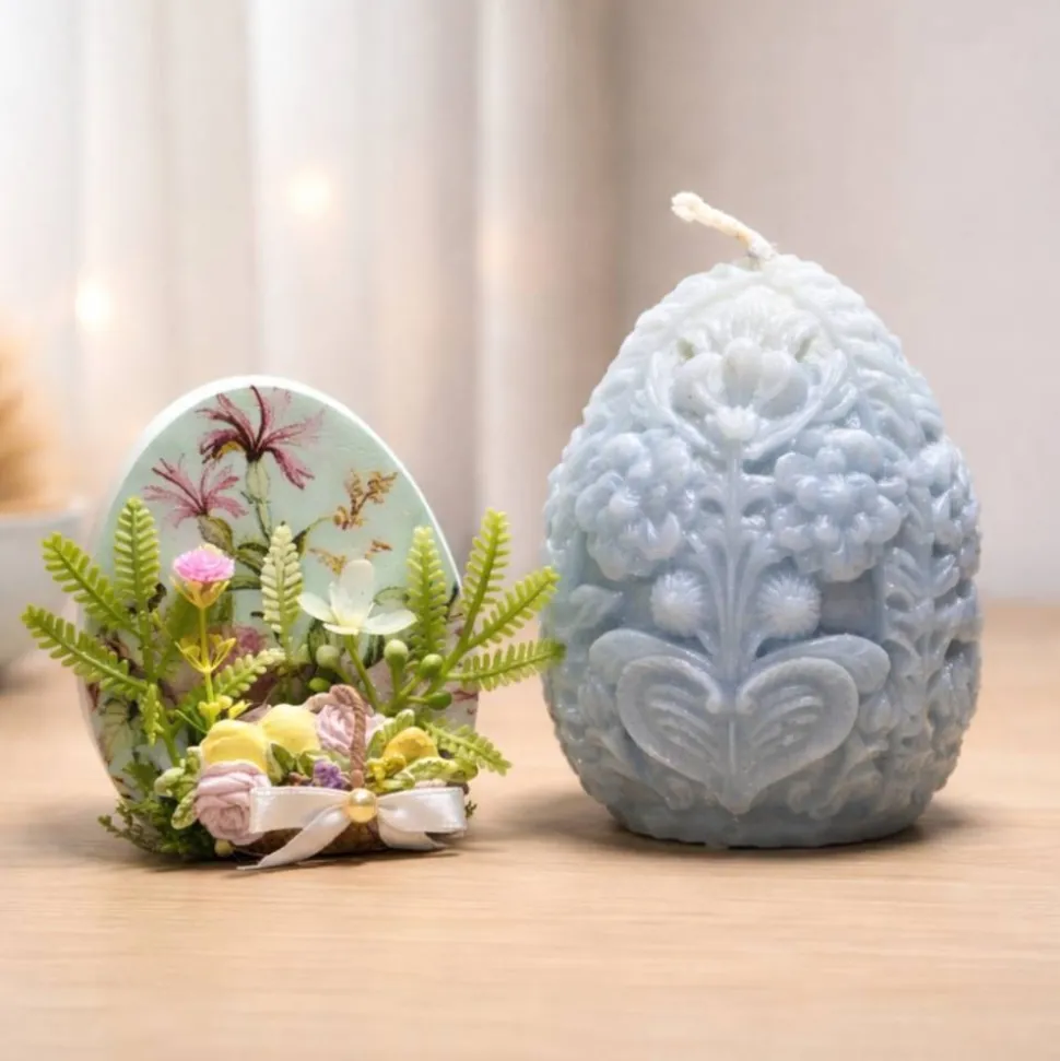 Kerze und ein Osterei mit aufwendiger handgemachter Verzierung.