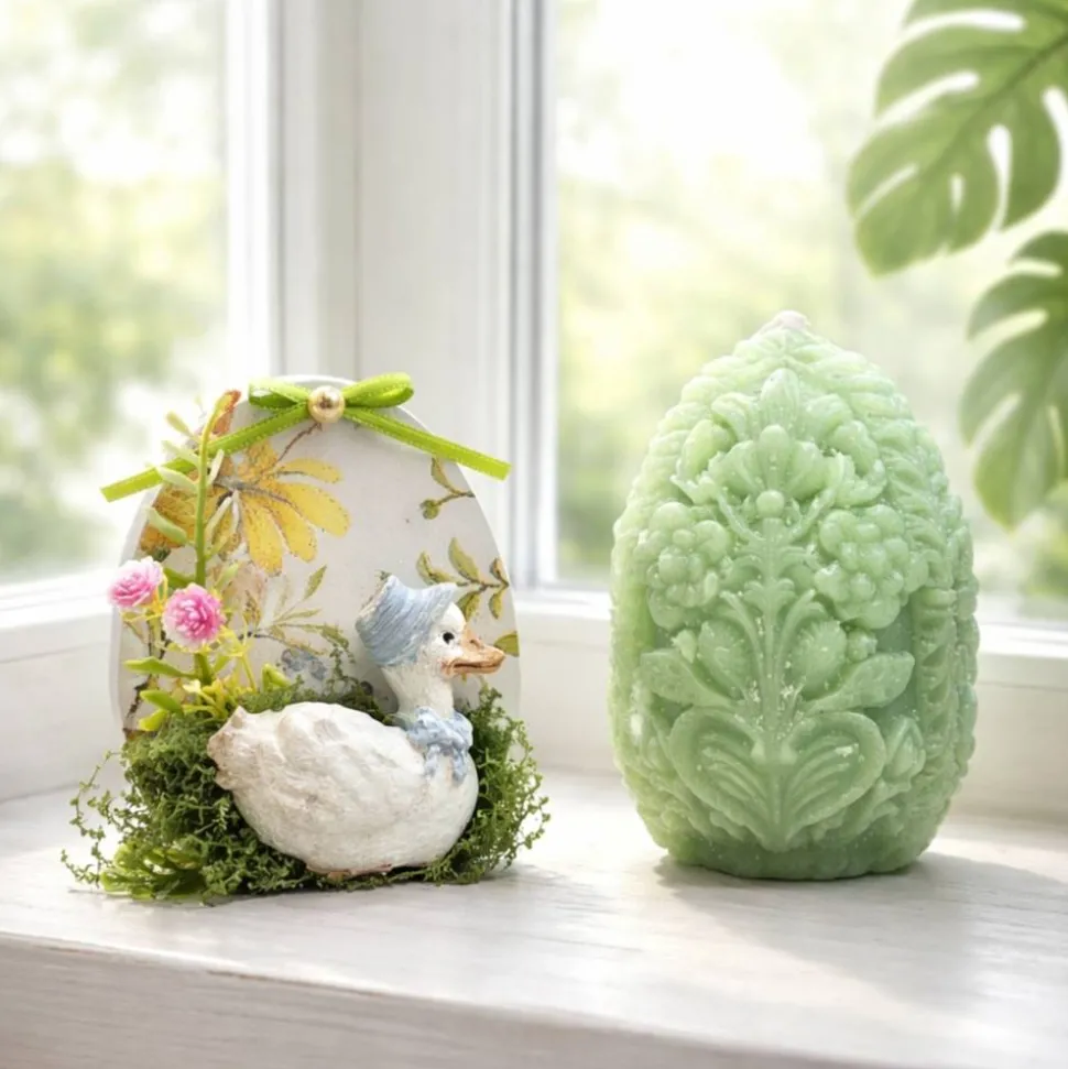 Das Osterei wurde aus Xyrarock gemacht die Verzierung ist aus Kaltporzellan in Handarbeit modelliert und es misst ca. 9,0×8,0x3,0 cm