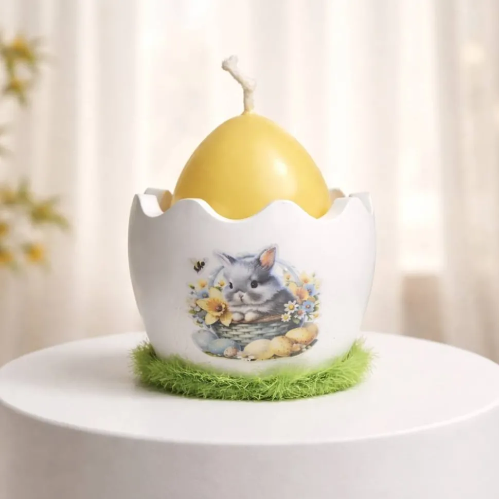 Die Ostereierschale ist aus Xyrarock und die Kerze hat die Form eines Ostereis.Die Eierschale misst ca. 6,5×5,0 cm, die ganze Dekoration ist in etwa 6,5×8,0 cm. groß.
