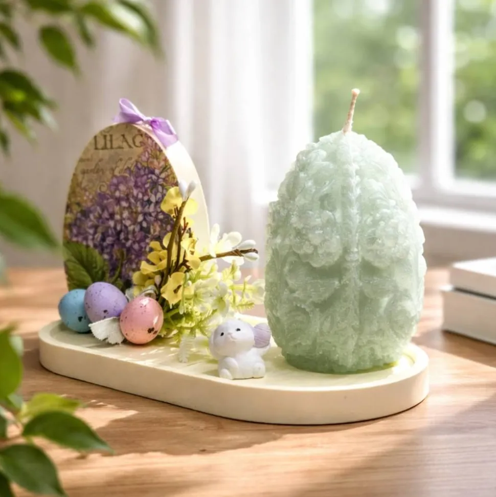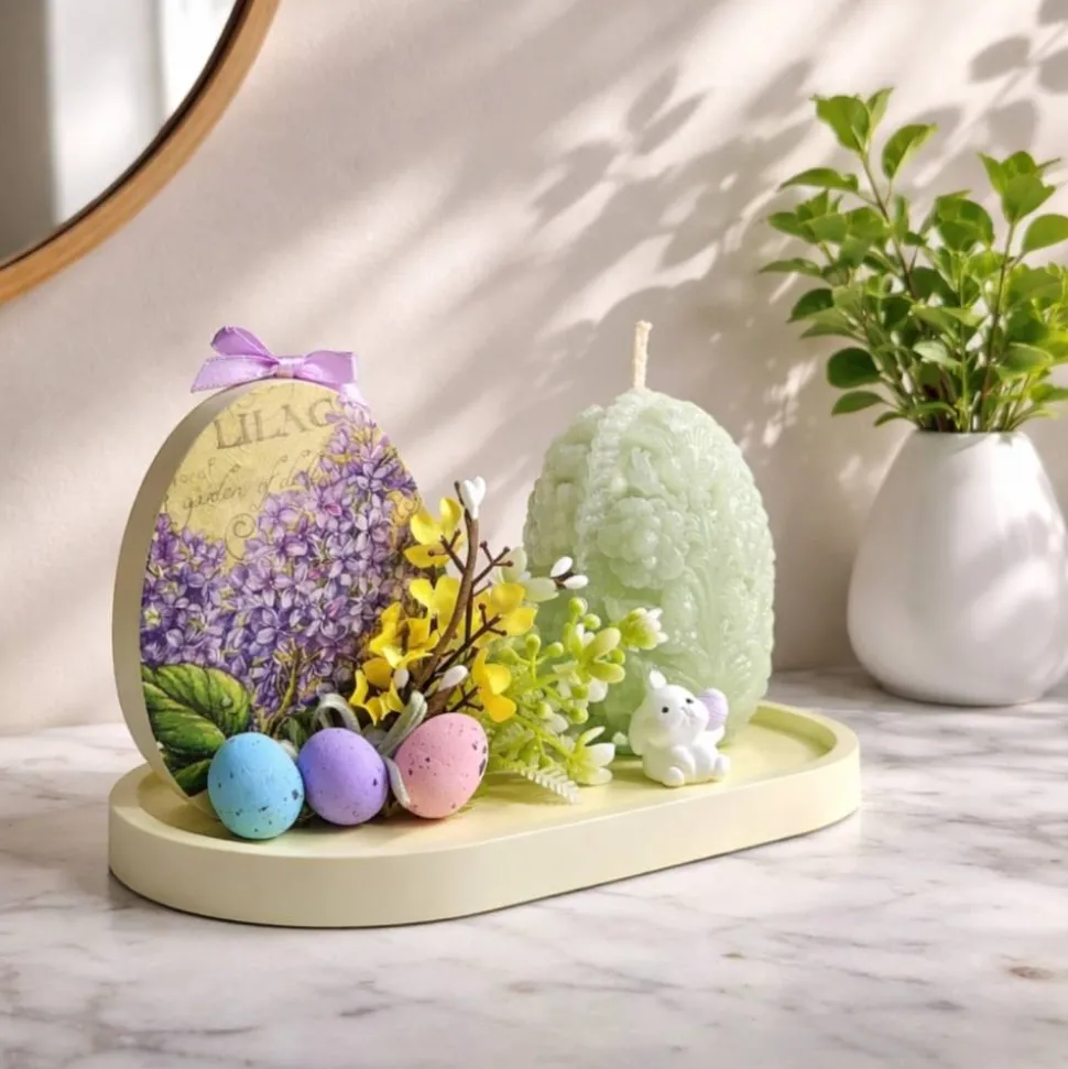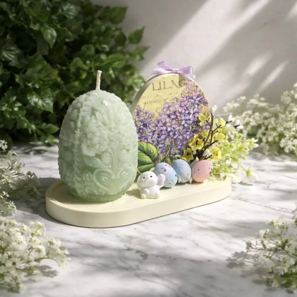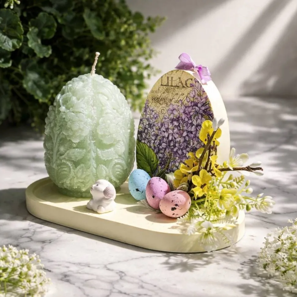 Auf einer Plattform steht ein großes, in Handarbeit geschmücktes und bemaltes Osterei, eine Ostereikerze (Handgegossen) und dazu ein niedlicher Osterhase.
