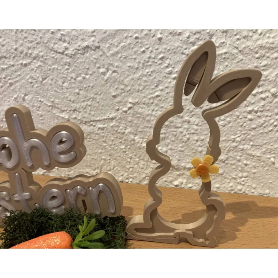 Die Osterdekoration besteht aus einem Aufsteller, mit dem transparenten Schriftzug „Frohe Ostern“, einem Osterhäschen als Silhouette und einer Dekoration aus speziellem Moos mit Zierelementen.