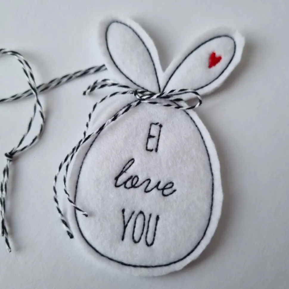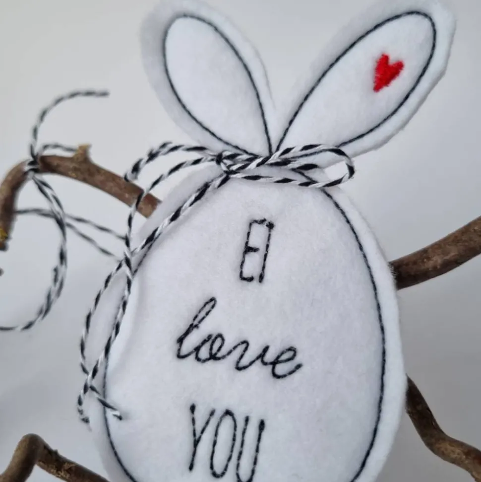 Das Osterei wurde aus doppeltem, gut 1,5 mm dickem Filz mit der Stickmaschine hergestellt (ITH), mit einem passenden schwarz-weißen Bändel zum Aufhängen versehen und mit einer kleinen Schleife vervollständigt.