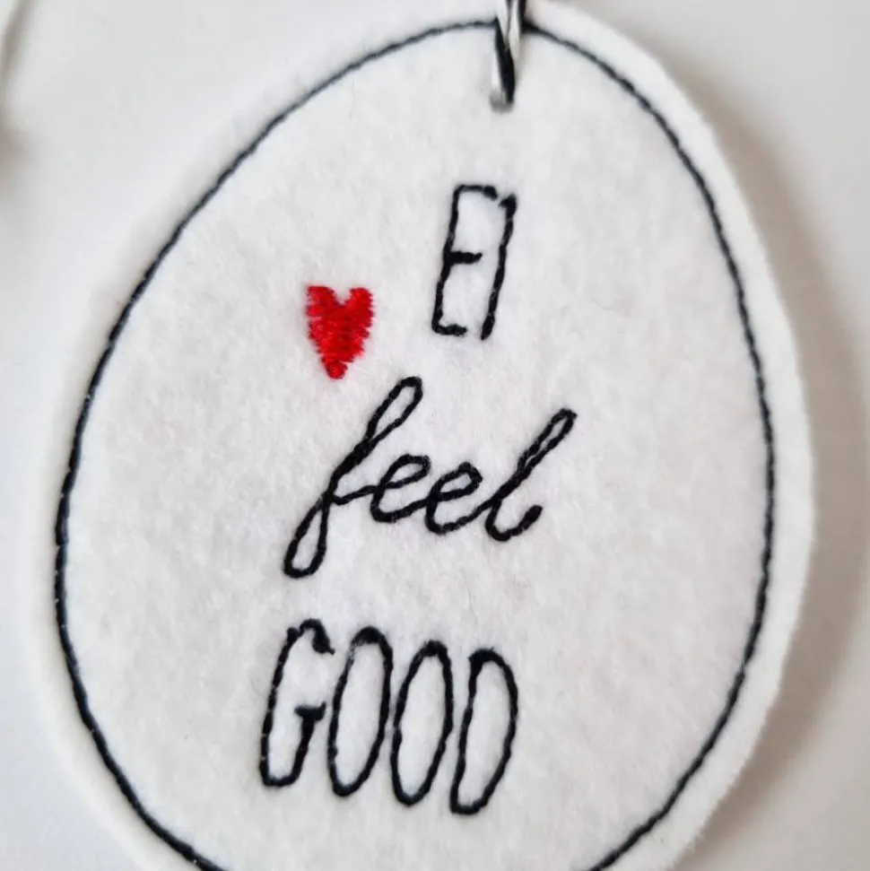 Das Osterei wurde aus doppeltem, gut 1,5 mm dickem Filz mit der Stickmaschine hergestellt (ITH), mit einem passenden schwarz-weißen Bändel zum Aufhängen versehen und mit zwei Holzperlen vervollständigt.