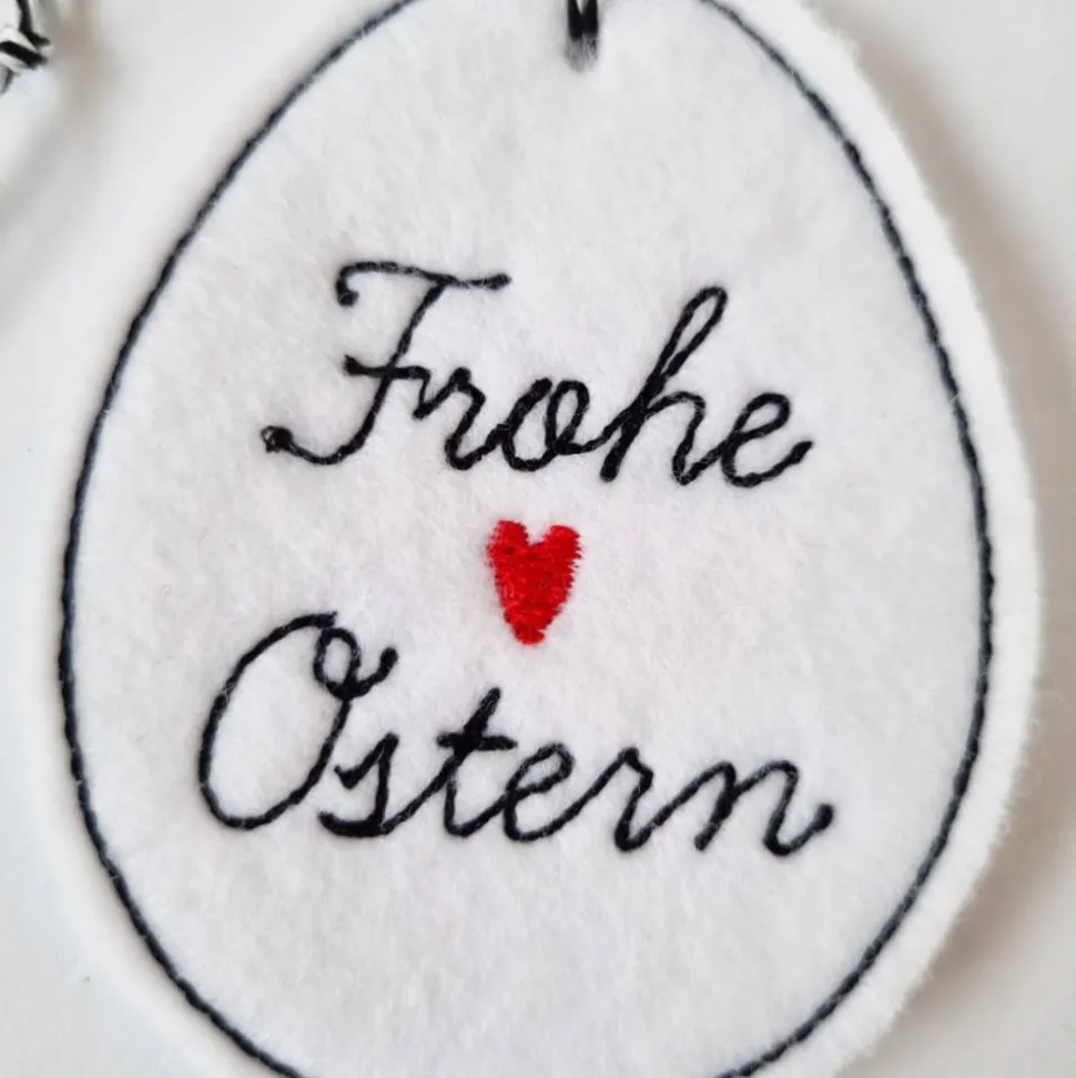 Das Osterei wurde aus doppeltem, gut 1,5 mm dickem Filz mit der Stickmaschine hergestellt (ITH), mit einem passenden schwarz-weißen Bändel zum Aufhängen versehen und mit zwei Holzperlen vervollständigt.