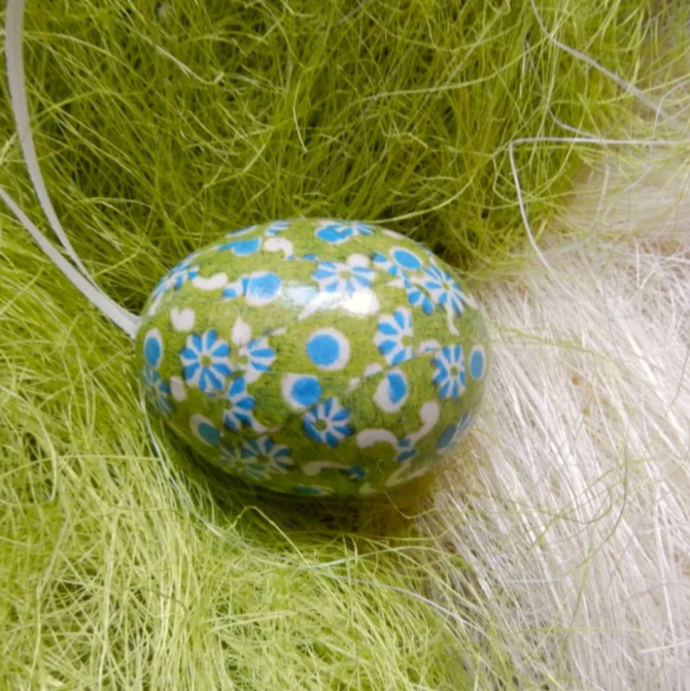 Es ist ca. 4 cm also Größe L (ausschließlich Freilandeier) und hat einen cremefarbenes Seidenband zum aufhängen.