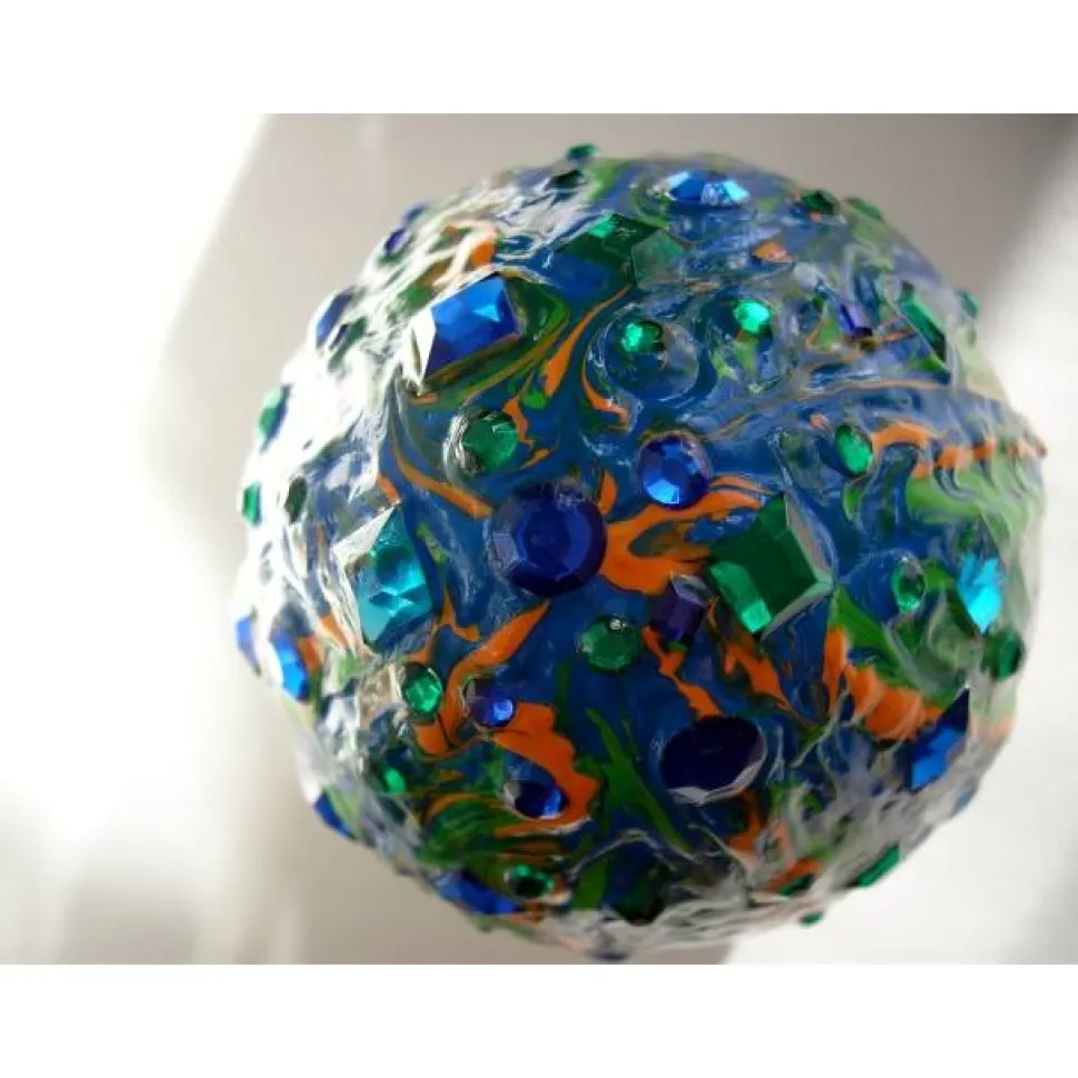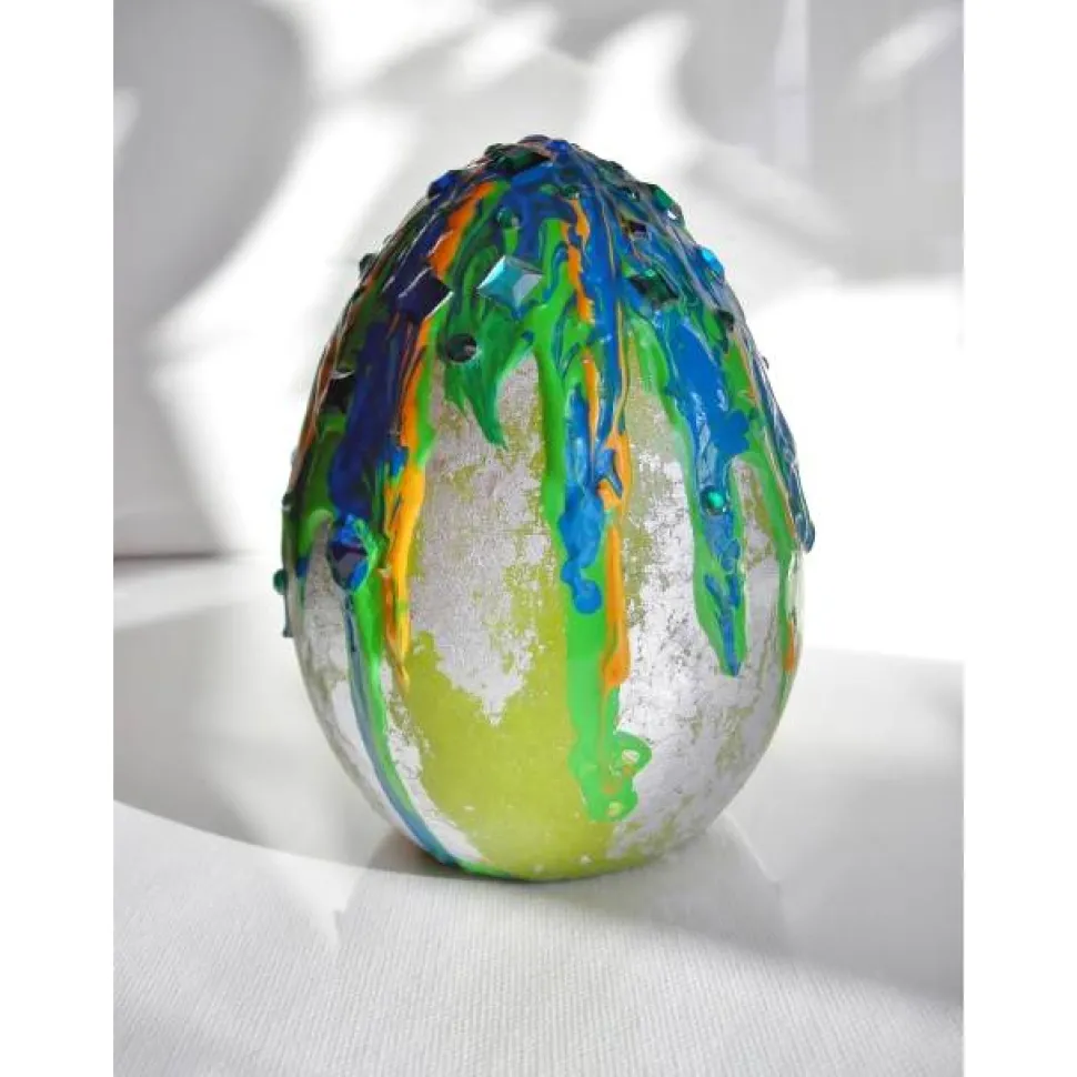Verwendete Materialien: Acrylfarben auf einem Keramik-Ei, gestaltet mit Glitzersteinen und Blattmetall.