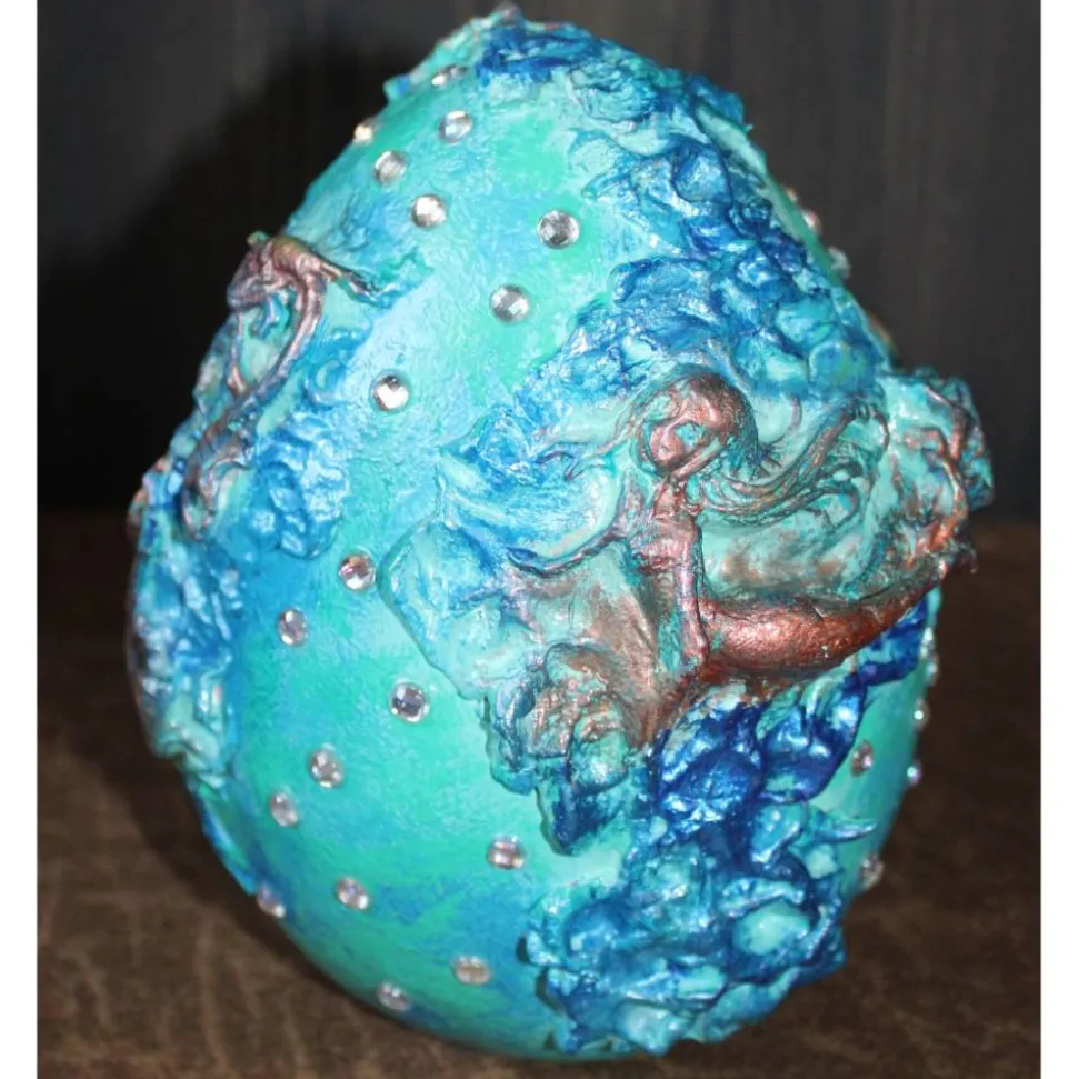 Verwendete Materialien: Acrylfarben, Modelliermasse auf einem Keramik-Ei, gestaltet mit Glitzersteinen.