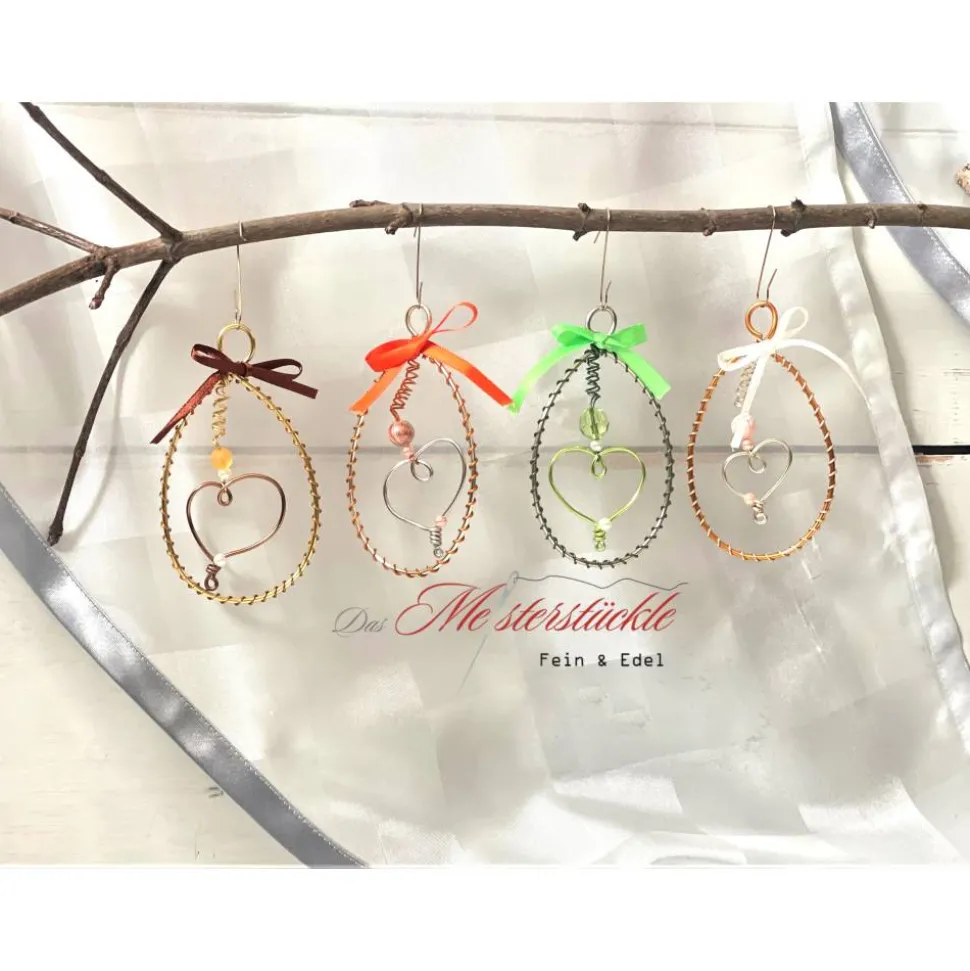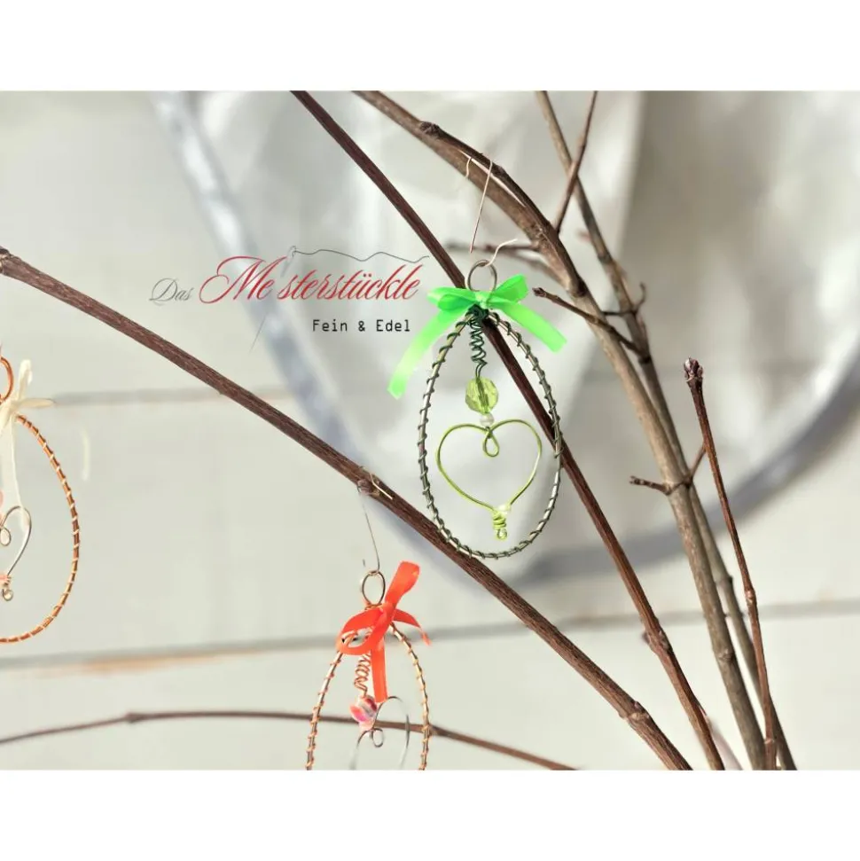Gearbeitet sind die Eier mit eloxiertem Aludraht in dem sich das Licht am Fenster wunderbar fängt.