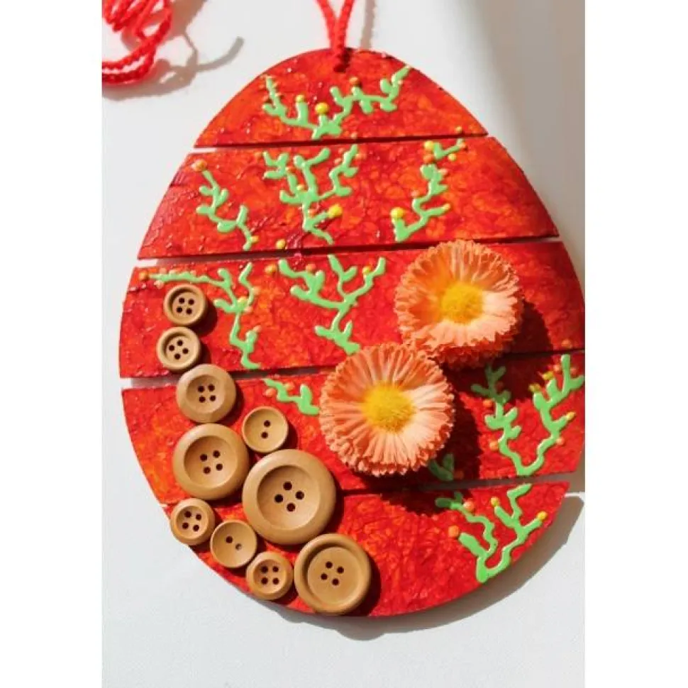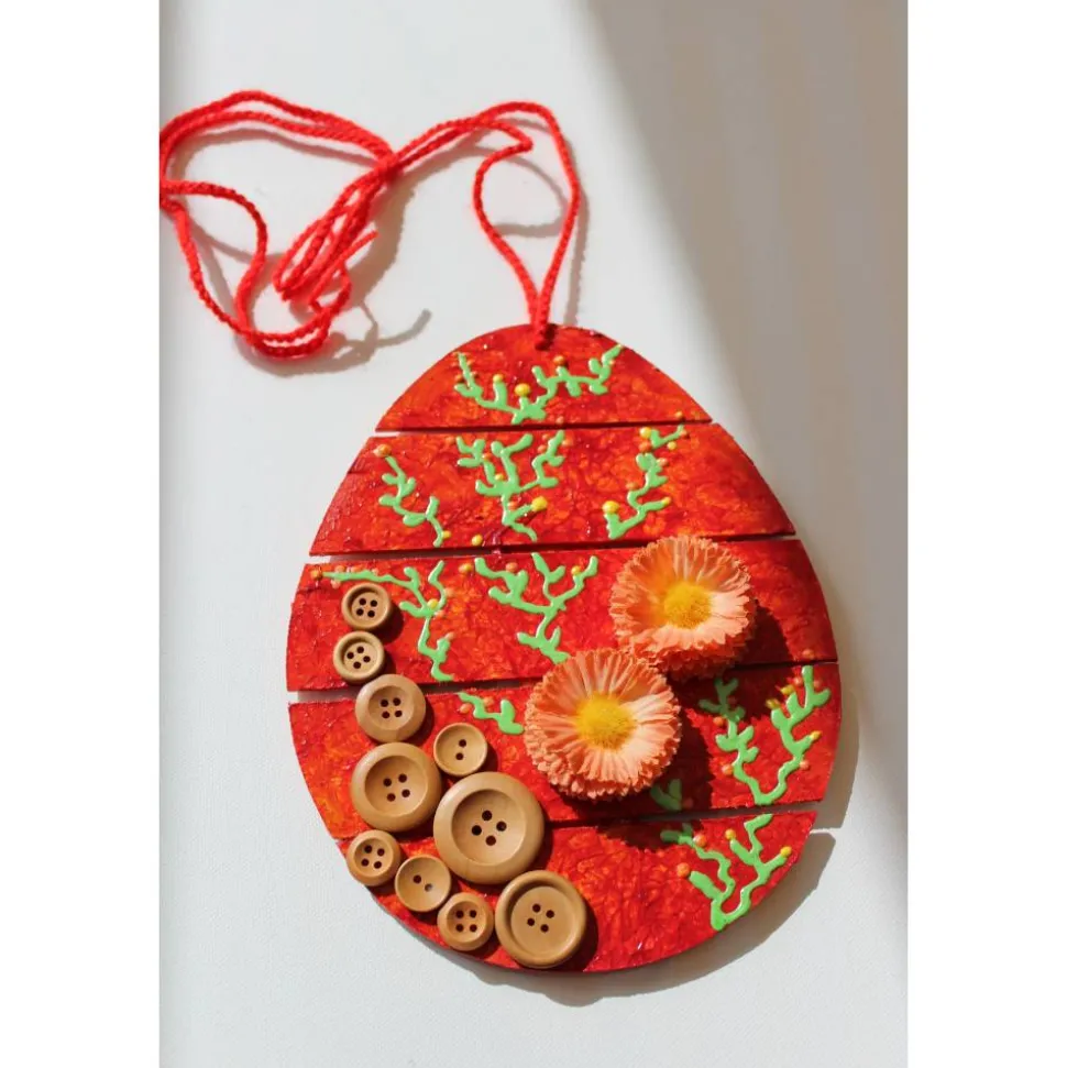 Mit Blüten, Acrylfarben und Holzknöpfen verziert.