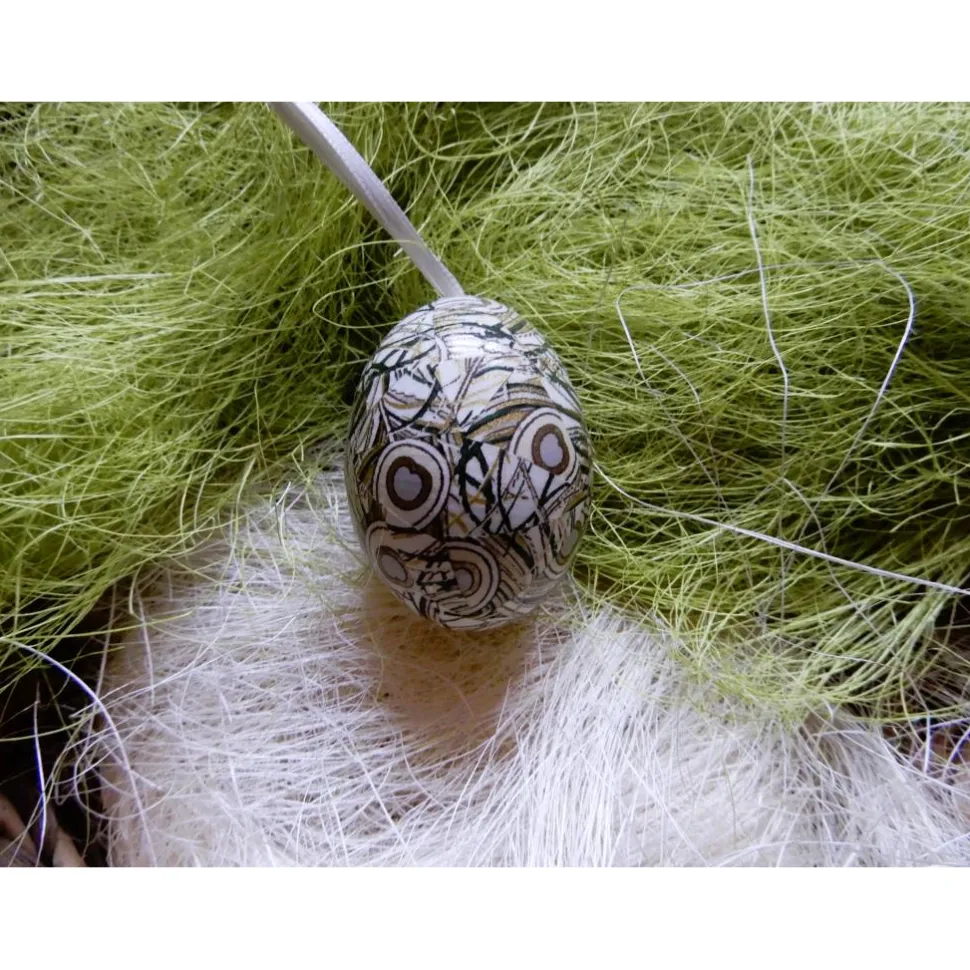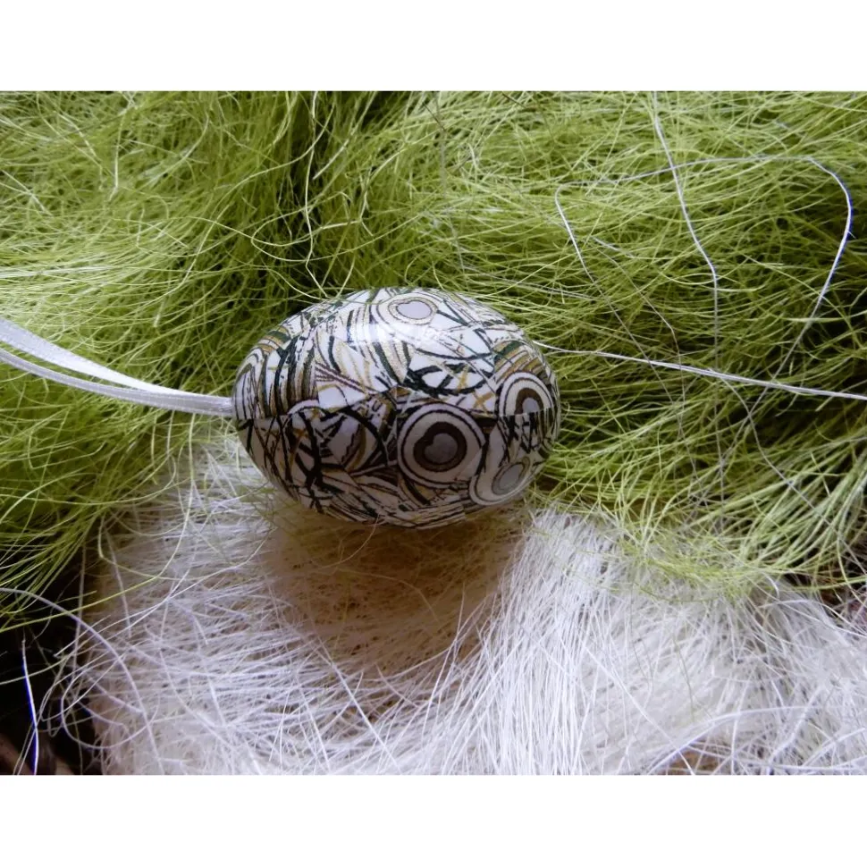 Es ist ca. 4 cm also Größe L (ausschließlich Freilandeier) und hat einen cremefarbenes Seidenband zum aufhängen.