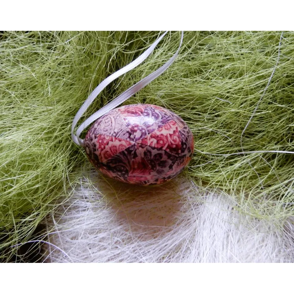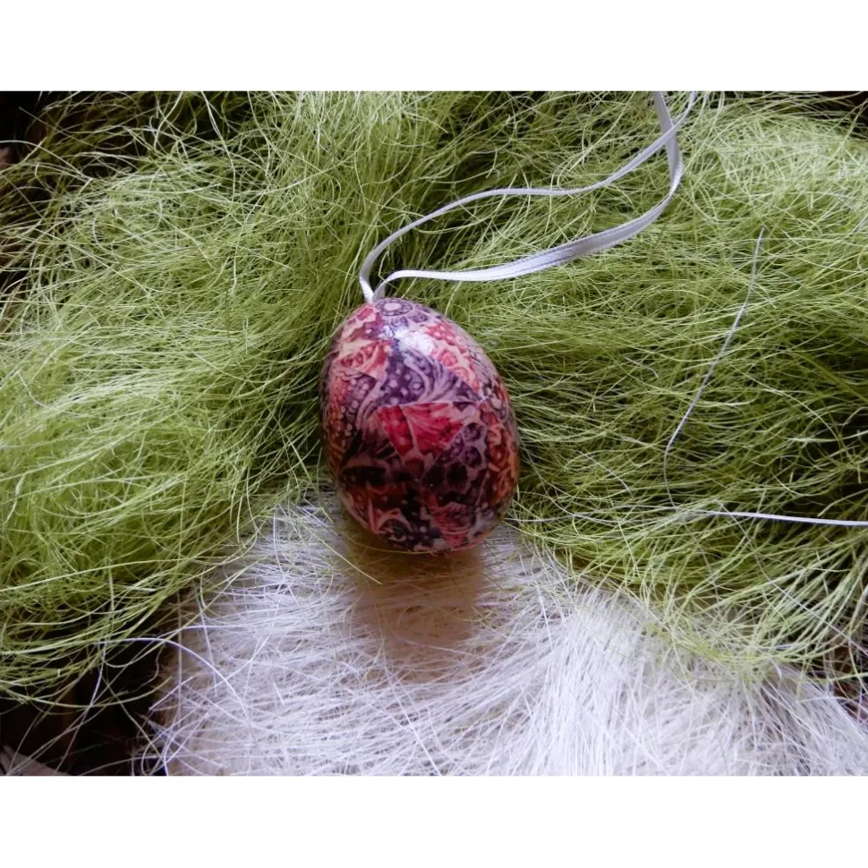 Es ist ca. 4 cm also Größe L (ausschließlich Freilandeier) und hat einen cremefarbenes Seidenband zum aufhängen.