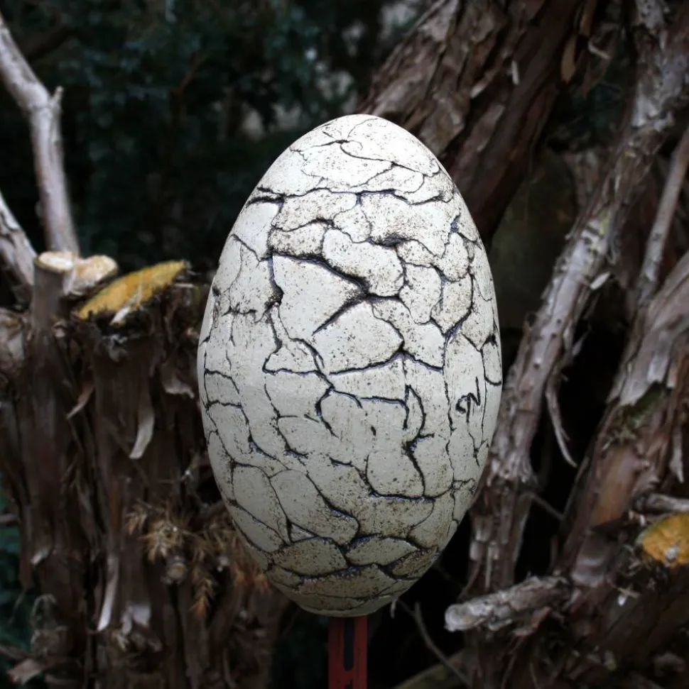 Natürlich gibt das Keramikei auch ganzjährig eine klasse Deko im Garten ab. Diese Keramikarbeit sieht tatsächlich etwas wie ein gesprungenes Ei kurz vor dem Schlüpfen von einem kleinen Urtierchen aus, wie ein kleines Drachenei vielleicht …
