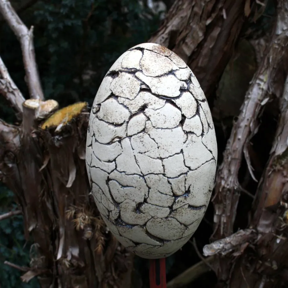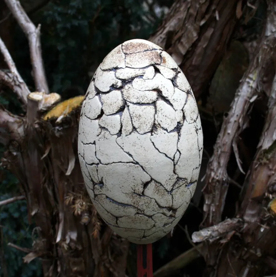 Natürlich gibt das Keramikei auch ganzjährig eine klasse Deko im Garten ab. Diese Keramikarbeit sieht tatsächlich etwas wie ein gesprungenes Ei kurz vor dem Schlüpfen von einem kleinen Urtierchen aus, wie ein kleines Drachenei vielleicht …