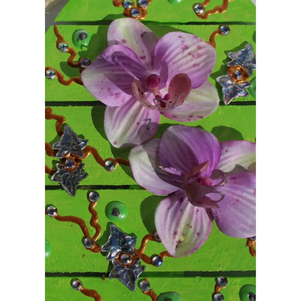 Mit Orchideenblüten und Glitzerelementen verziert.