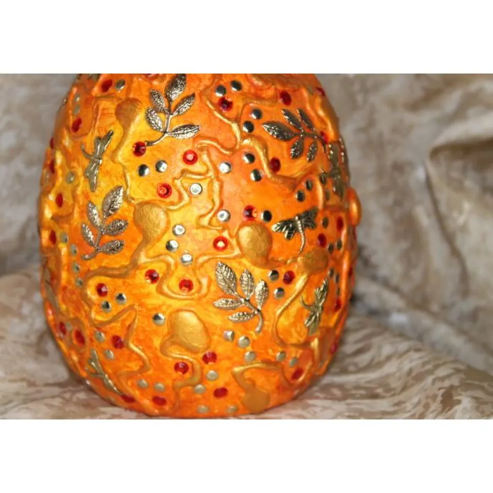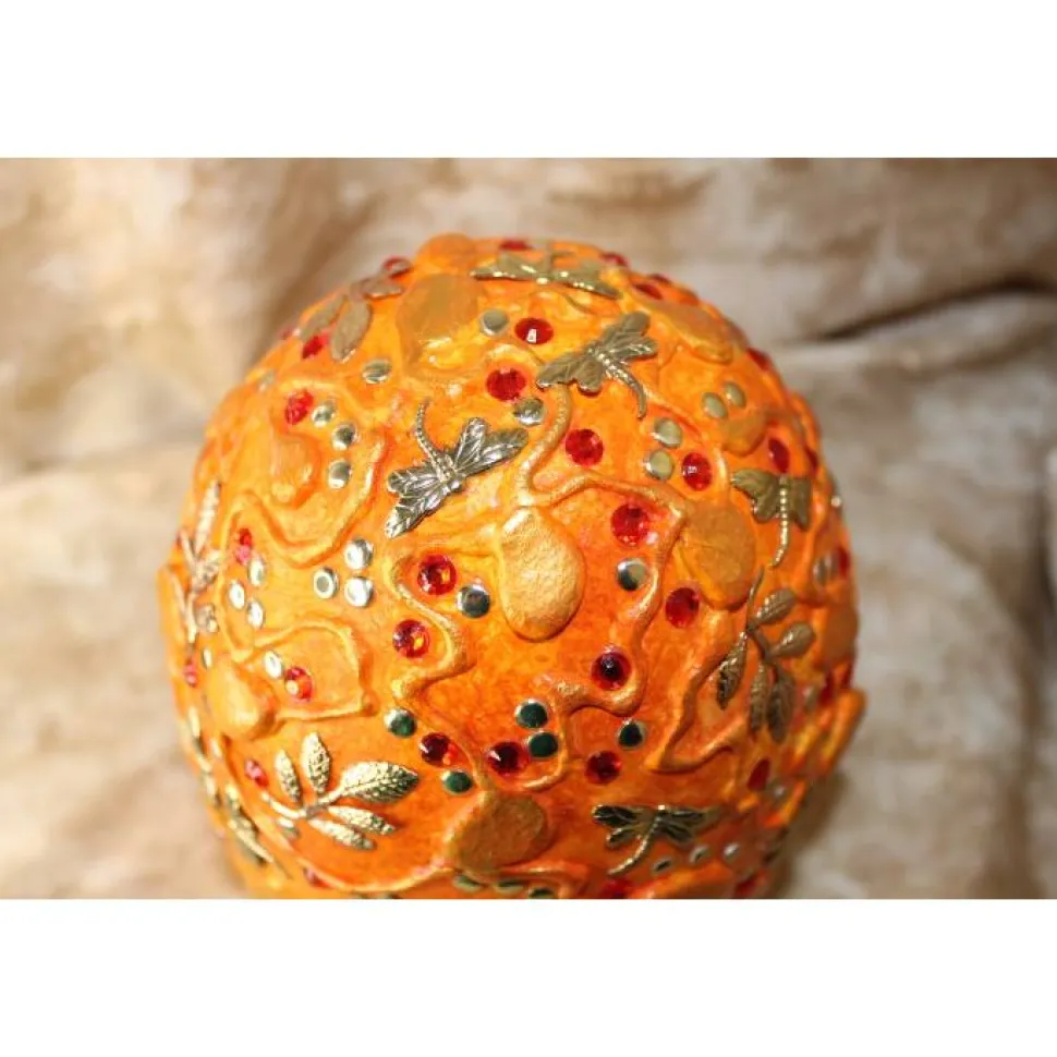Verwendete Materialien: Acrylfarben und Modelliermasse auf einem Keramik-Ei, Metallblätter, Metalllibellen, Kunststoffsteine