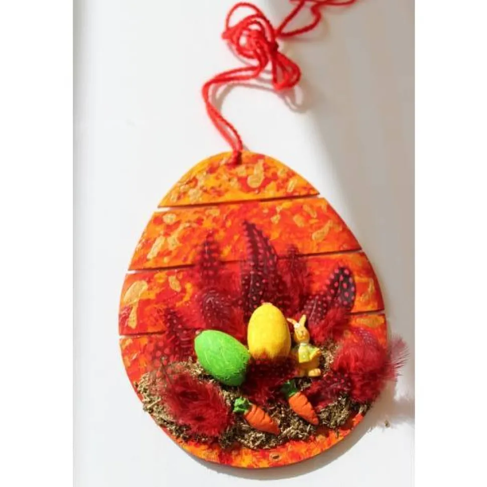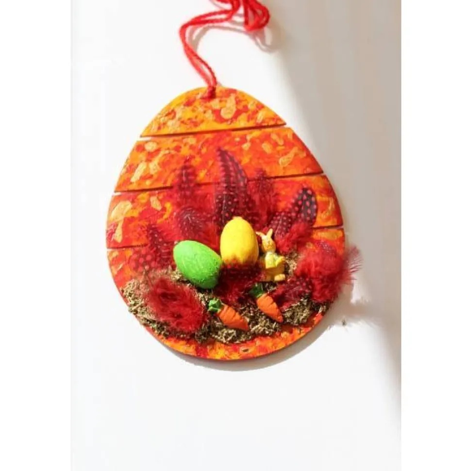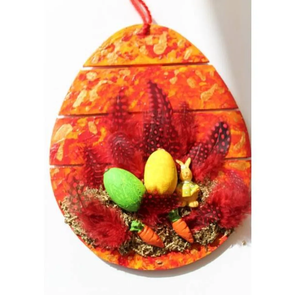Mit Metallelementen, Federn, Holzeiern, Hase und Glitzersteinen verziert.
