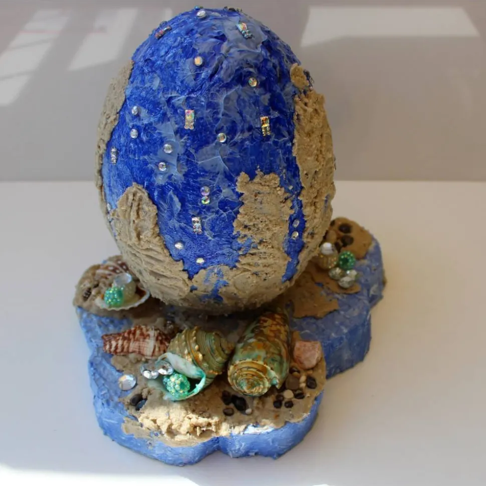 Maritimes Deko-Ei aus Styropor, verziert mit Acrylfarben, Glitzersteinen, Perlen und Muscheln, befestigt auf einer kleinen Plattform. Tolle Effekte durch die Verwendung von Modelliermasse.