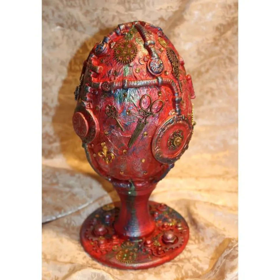 Kunststoffei mit Modelliermasse und Acrylfarben in Kupfer, Gold, Braun, Schwarz, Blau, Grün und Rot gestaltet.