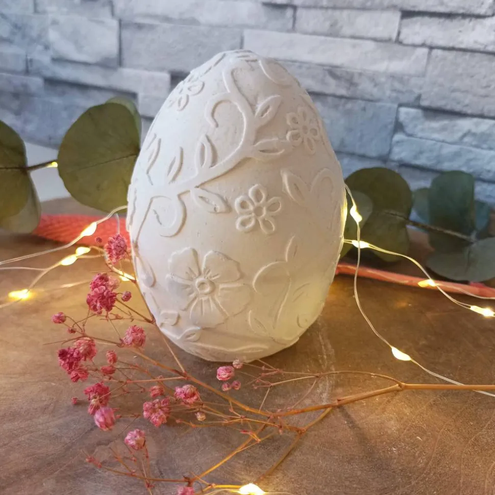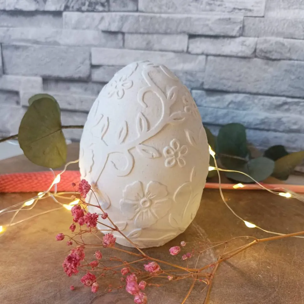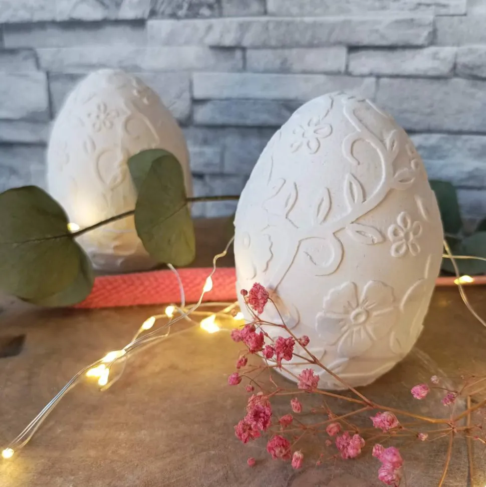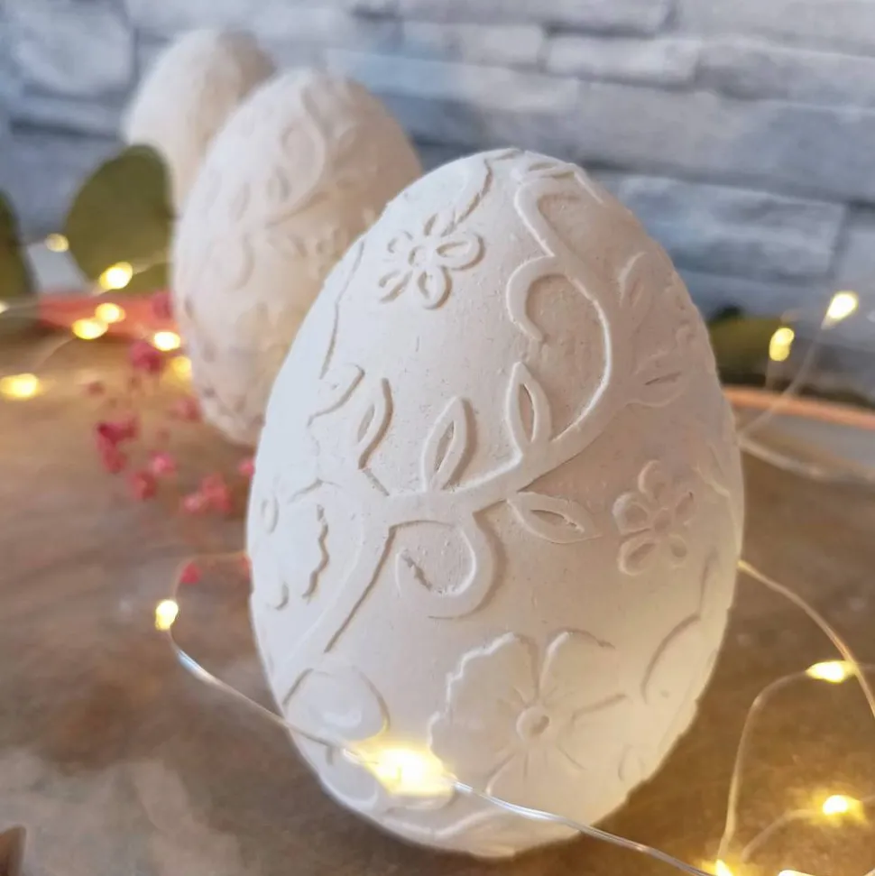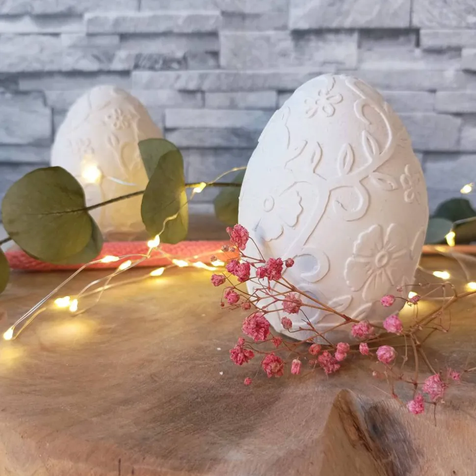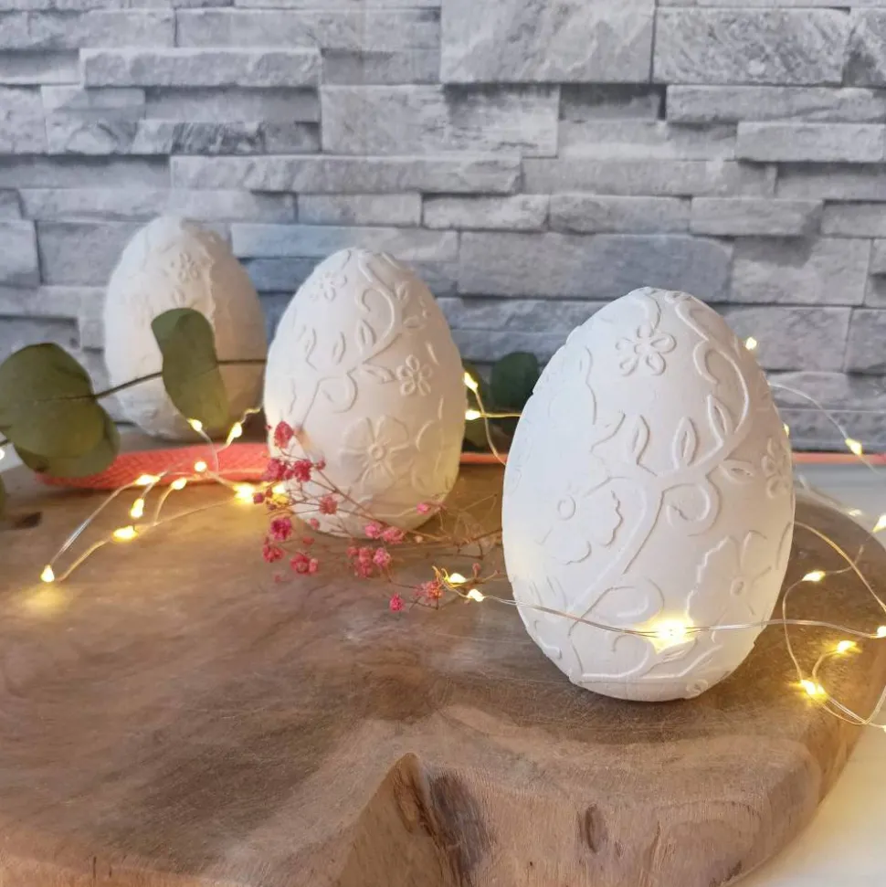 Meine Ostereier sind aus Raysin oder Keraflott gefertigt, einem feinen, weißen Gießpulver auf Gipsbasis. Dieses Material kann leichte Unregelmäßigkeiten und Lufteinschlüsse aufweisen, die jedoch keinesfalls als Mangel angesehen werden sollten. Im Gegenteil, sie tragen zur Einzigartigkeit jedes handgefertigten Unikats bei.