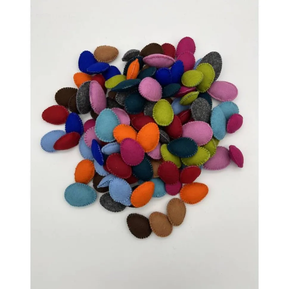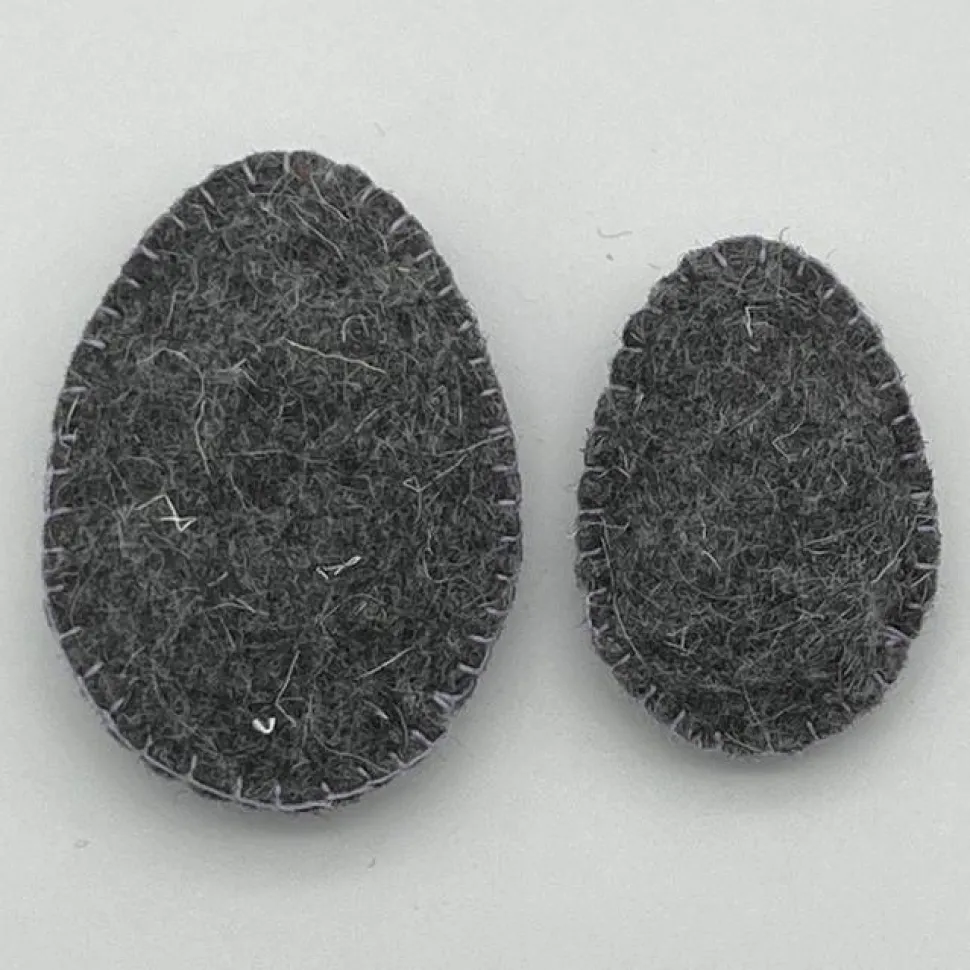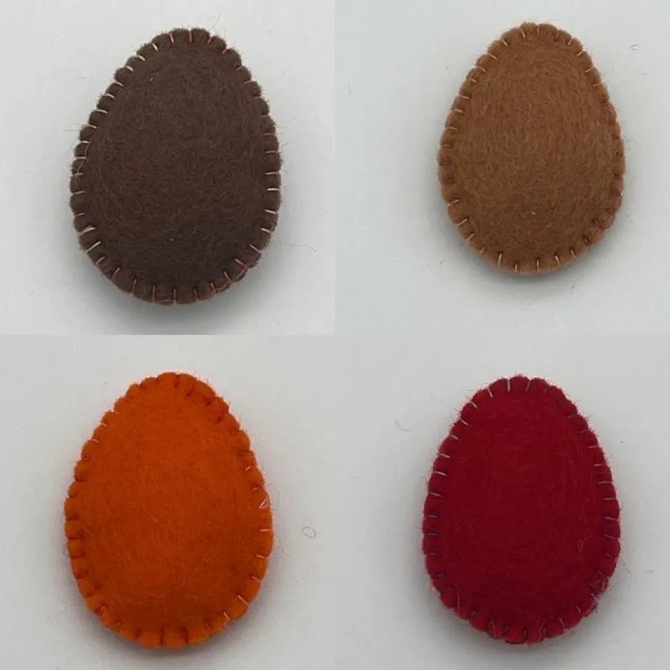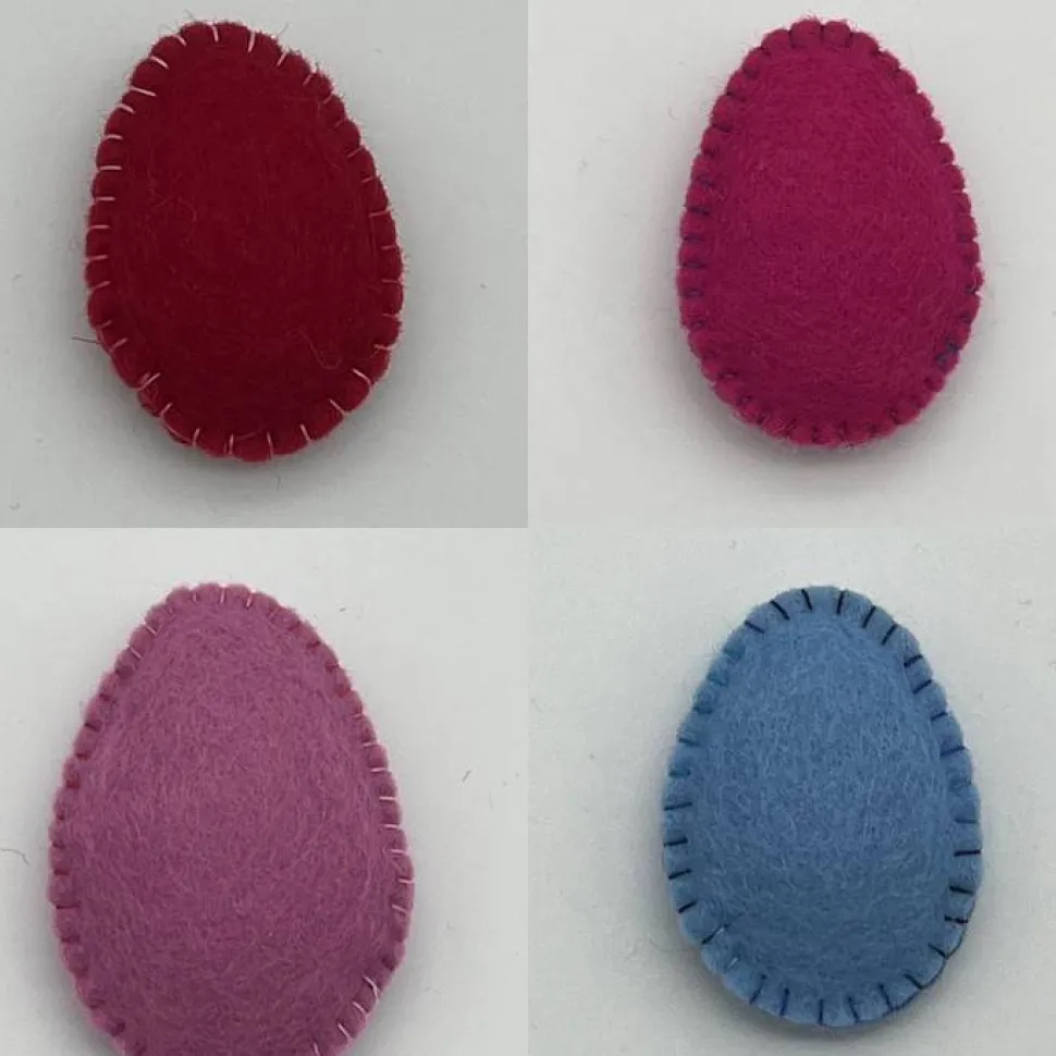 Die Ostereier sind von Hand aus Wollfilz genäht und mit Füllwatte ausgestopft. Sie sind an einem dünnen Lylonfaden befestigt somit kann man sie prima in einen Osterstrauß oder auch als Deko ans Fenster gehängt werden. Aber auch auf dem Jahreszeitentisch im Osternest finden sie ein Plätzchen. Es gibt sie in vielen verschiedenen Farben Sie sind ca 5 bzw 6 cm groß.