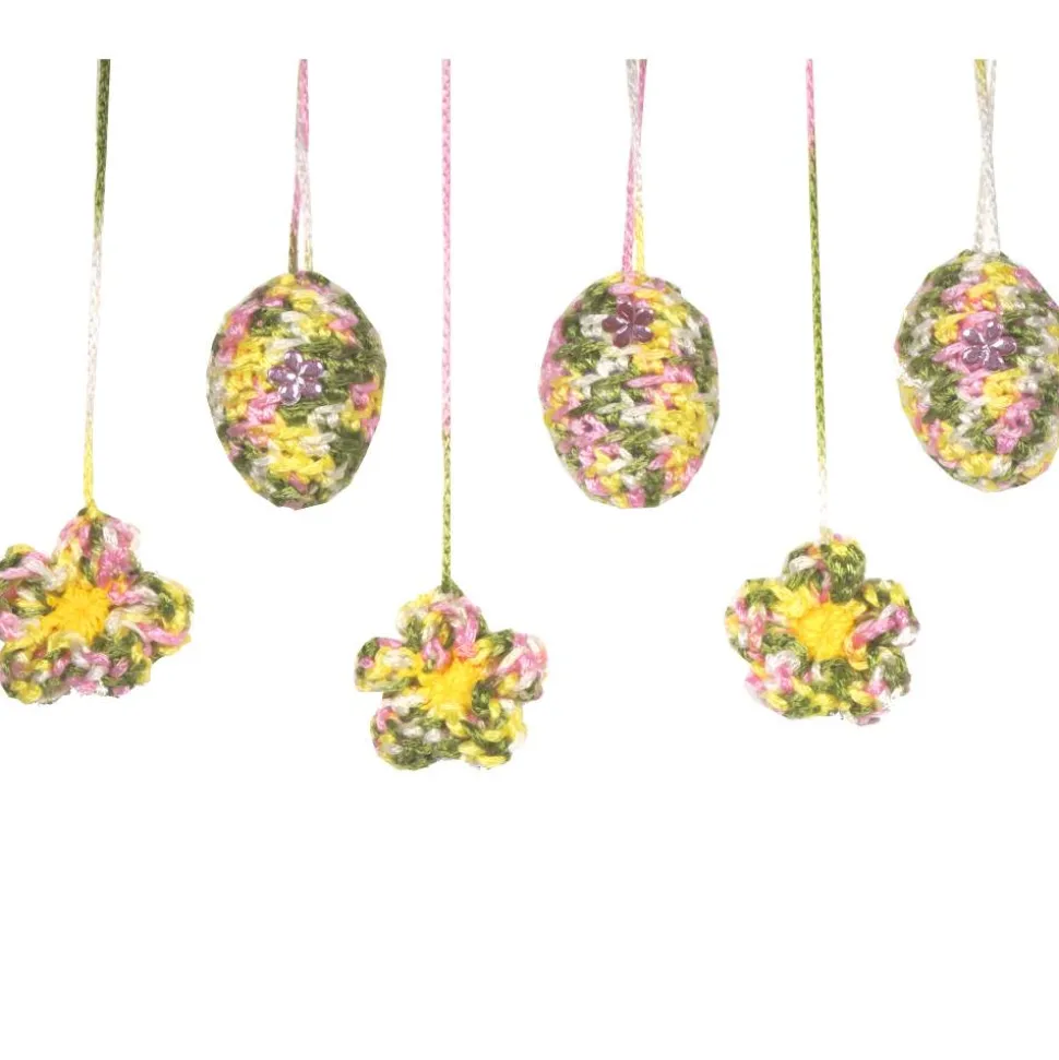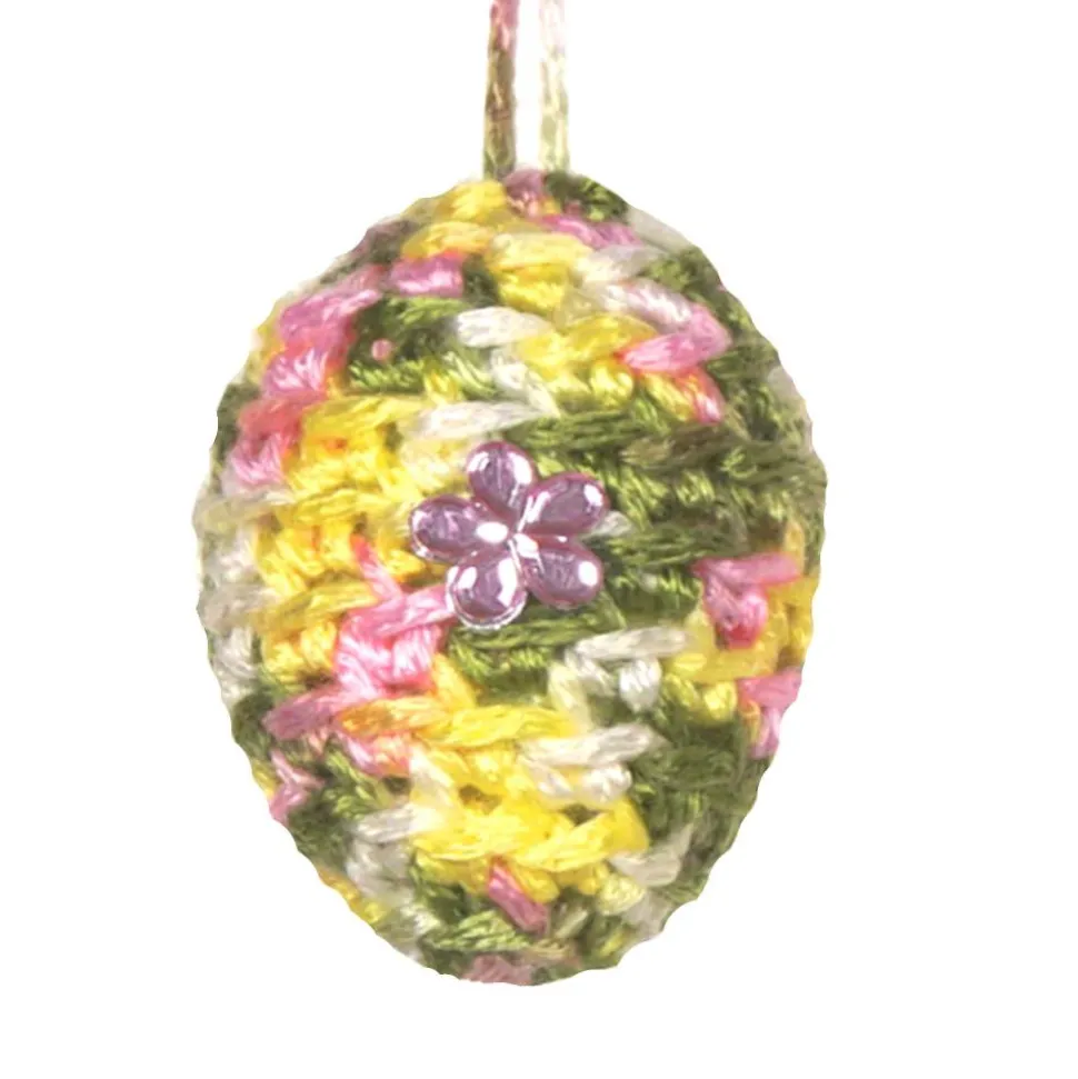 Ein liebevoll handgefertigtes Ostereier Set: Du erhältst 3 dekorative Ostereier und 3 Blüten zum Aufhängen – gehäkelt in zarten Pastellfarben wie rosa, weiß, grün und gelb. Jedes Ei wurde sorgfältig mit festen Maschen um ein Kunststoff Ei gearbeitet und mit funkelnden Kunststoffblüten als glänzendes Highlight verziert.