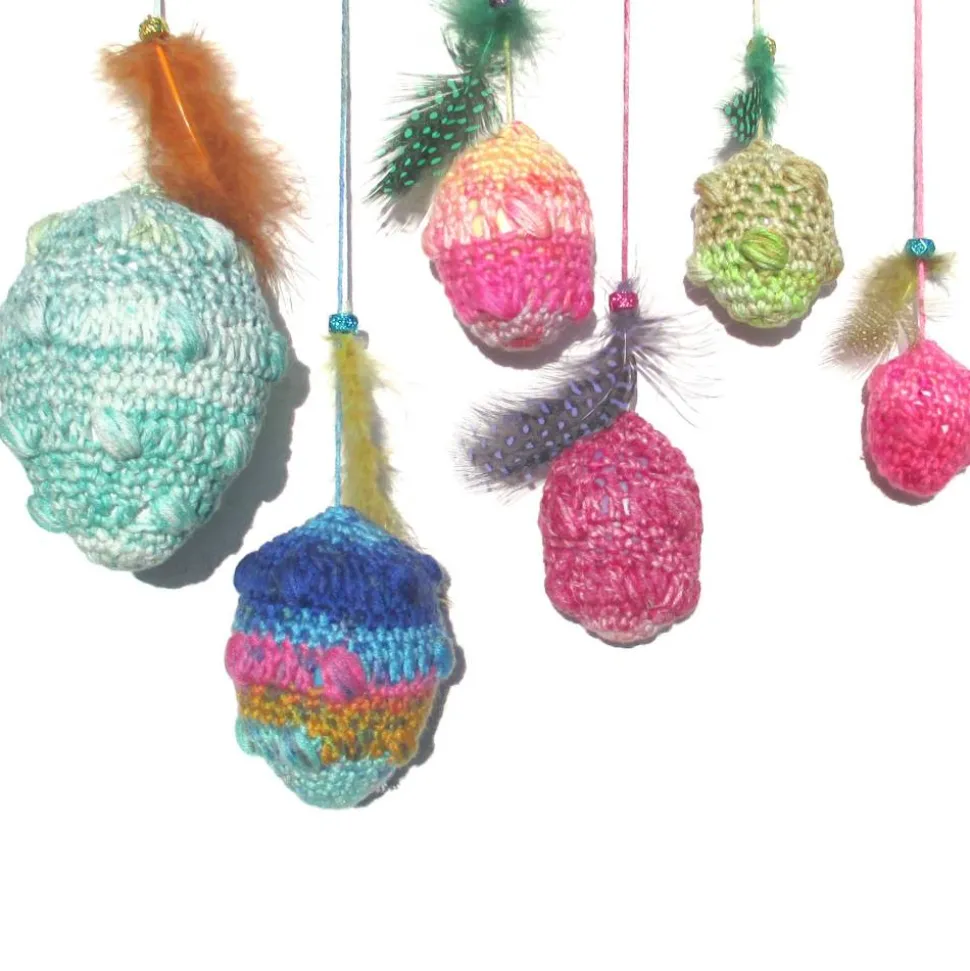 Diese liebevoll umhäkelten Ostereier sind ein echter Blickfang für ihr Zuhause. Jedes Ei wurde mit bunter Farbverlaufswolle und hübschem Noppenmuster umhäkelt und ist mit einer dekorativen Kunststoffperle und echten gefärbten Hühnerfedern verziert. Die extra langen Aufhängerfäden ermöglichen es ihnen, die Eier flexibel am Fenster oder im Osterstrauß zu arrangieren.