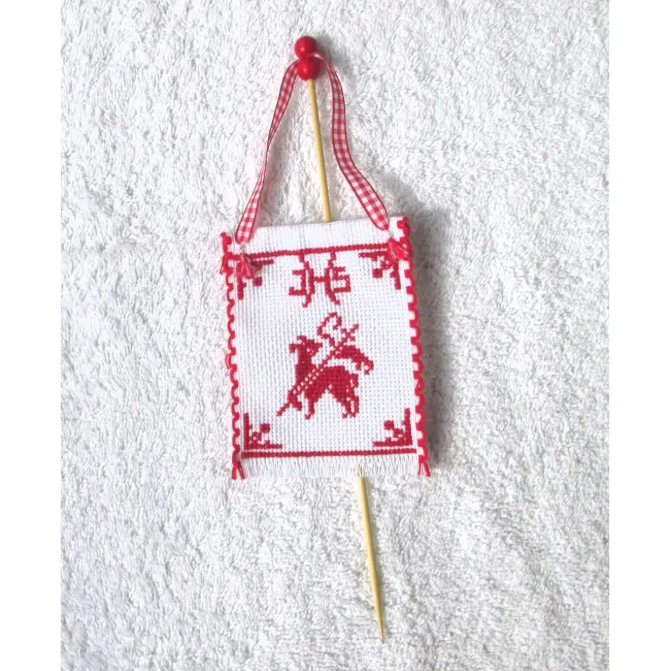 Religiöses Kreutzstich Motiv auf fein gewebten Aida Band, mit rotem Randmuster unten mit Fransen.