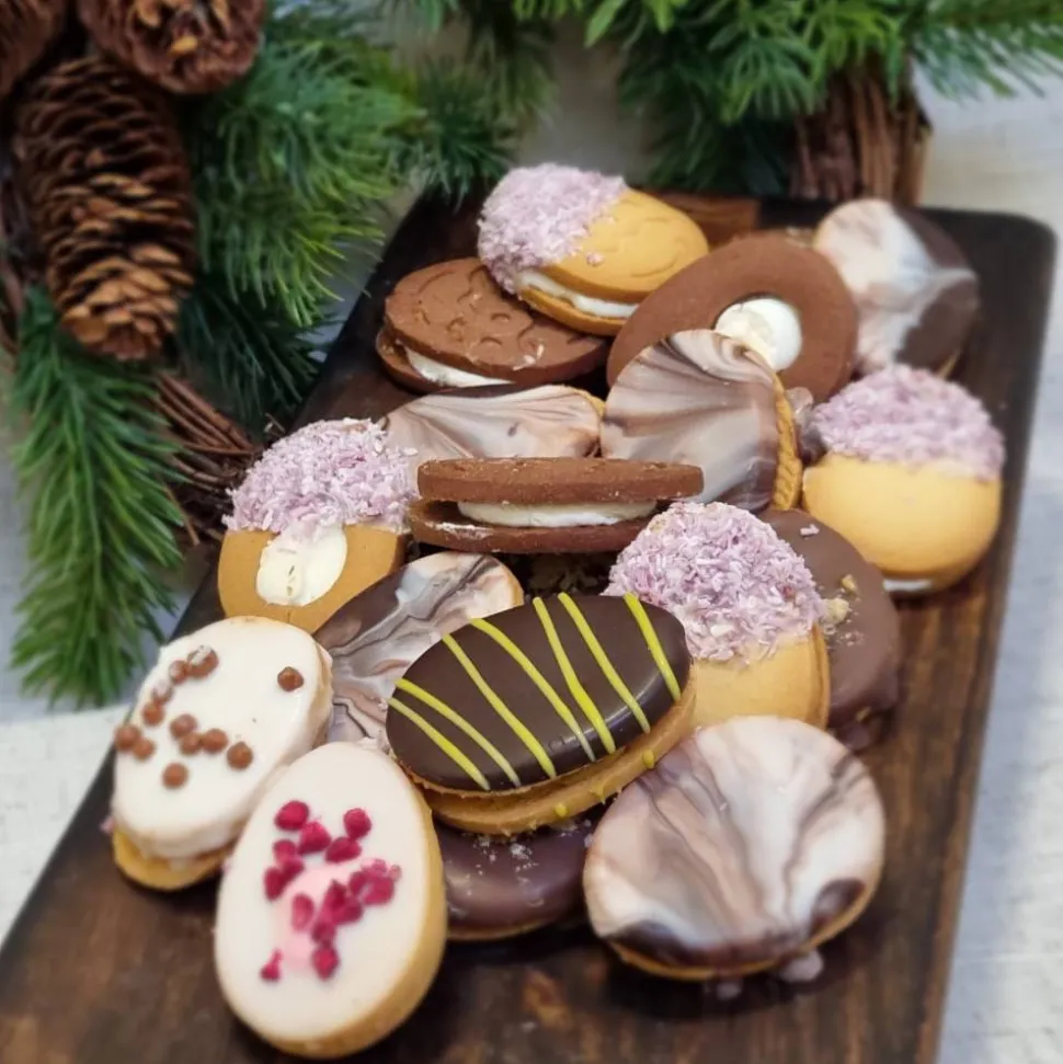 Das Gebäck enthält Weizen, Soja, Ei, Walnüsse, Haselnüsse, Mandeln, Pistazien und Milchprodukte.