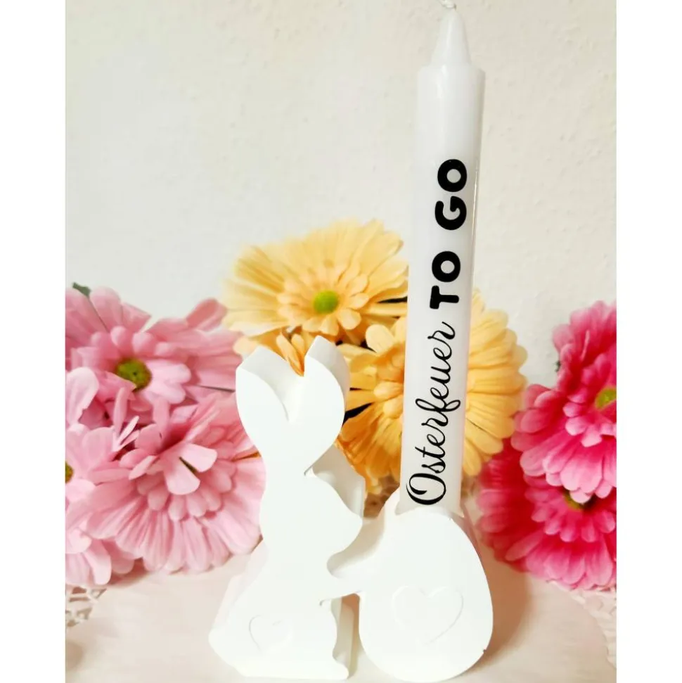 Pro Artikel erhalten Sie einen Osterhasen-Kerzenhalter aus Gießmasse mit beschrifteter Kerze.