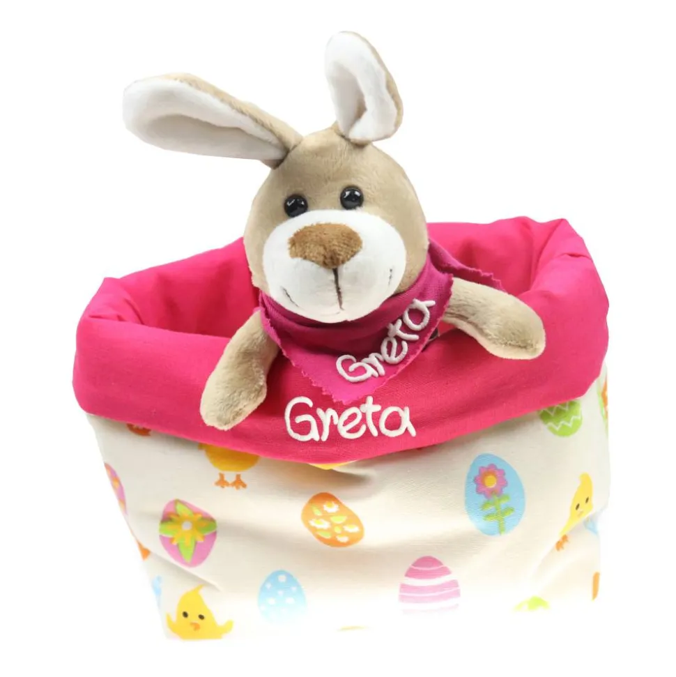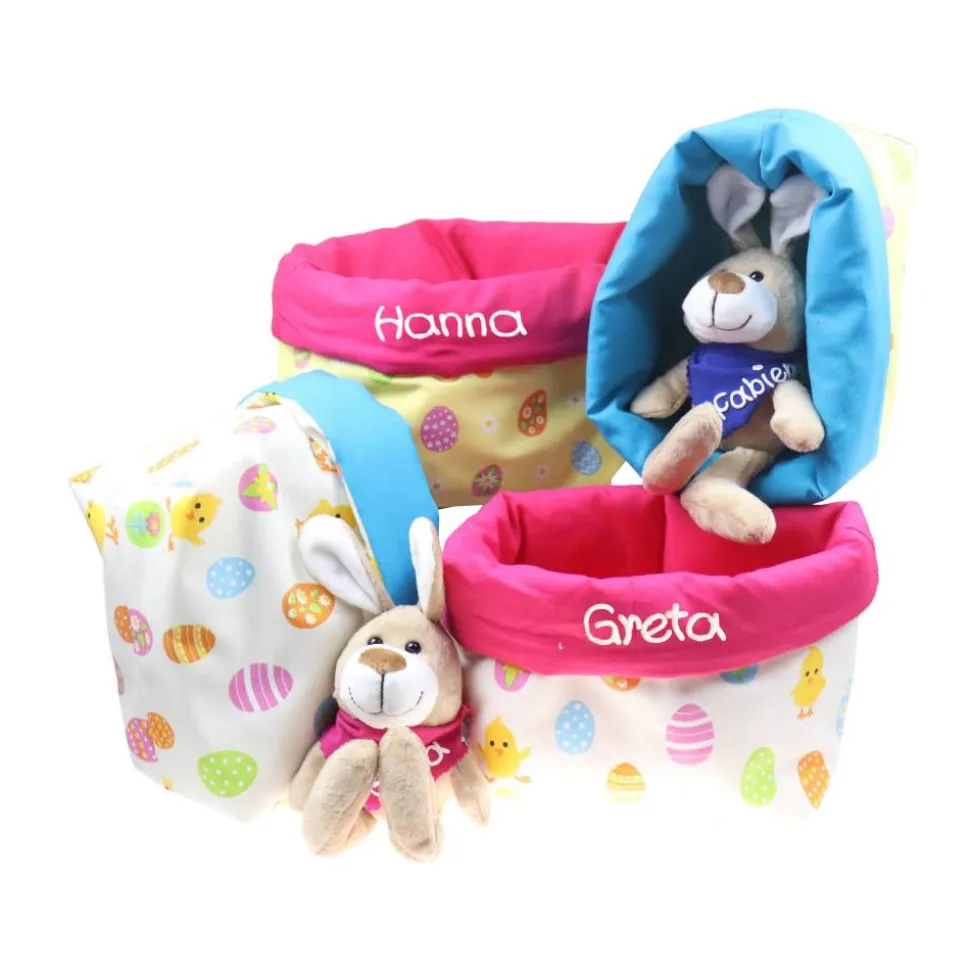 Ein tolles Ostergeschenk für große und kleine Kinder. Ein Stoffkörbchen zum Befüllen und ein niedlicher Osterhase, der genauso wie das Utensilo mit dem Namen des Kindes beschriftet wird.
