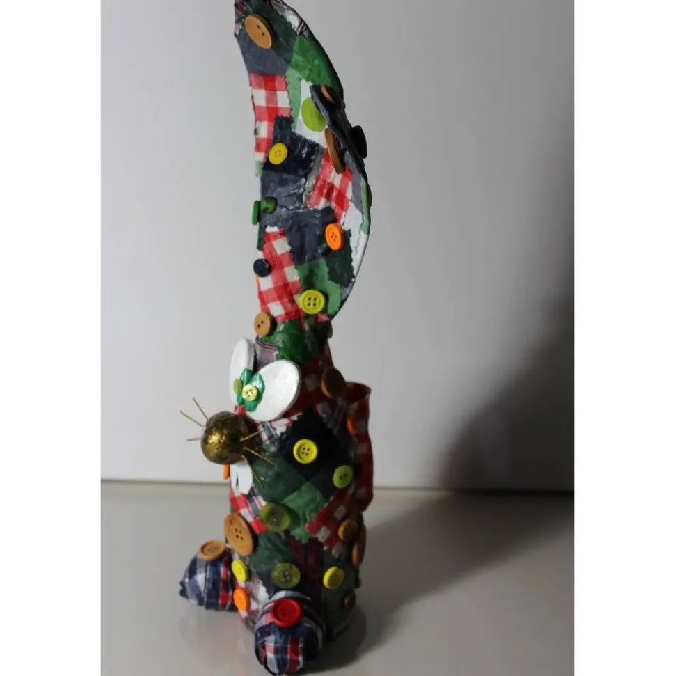 Witziges Upcycling-Projekt aus einer Glasflasche, gestaltet mit Altpapier, Holz, Stoffresten Modelliermasse, Kunststoff und Acrylfarbe. Eine Künstlerfigur der etwas anderen Art aus upgecycelten Materialien, wie Draht, Knöpfe, Milchtütenpapier, Korken, Plastikdeckeln, etc. !