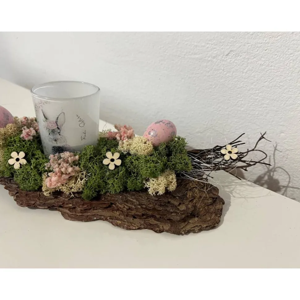 Hier biete ich ein schönes Ostergesteck auf einer Baumrinde mit Teelichthalter an, dass ich mit sehr viel Liebe zum Detail hergestellt habe 🙂