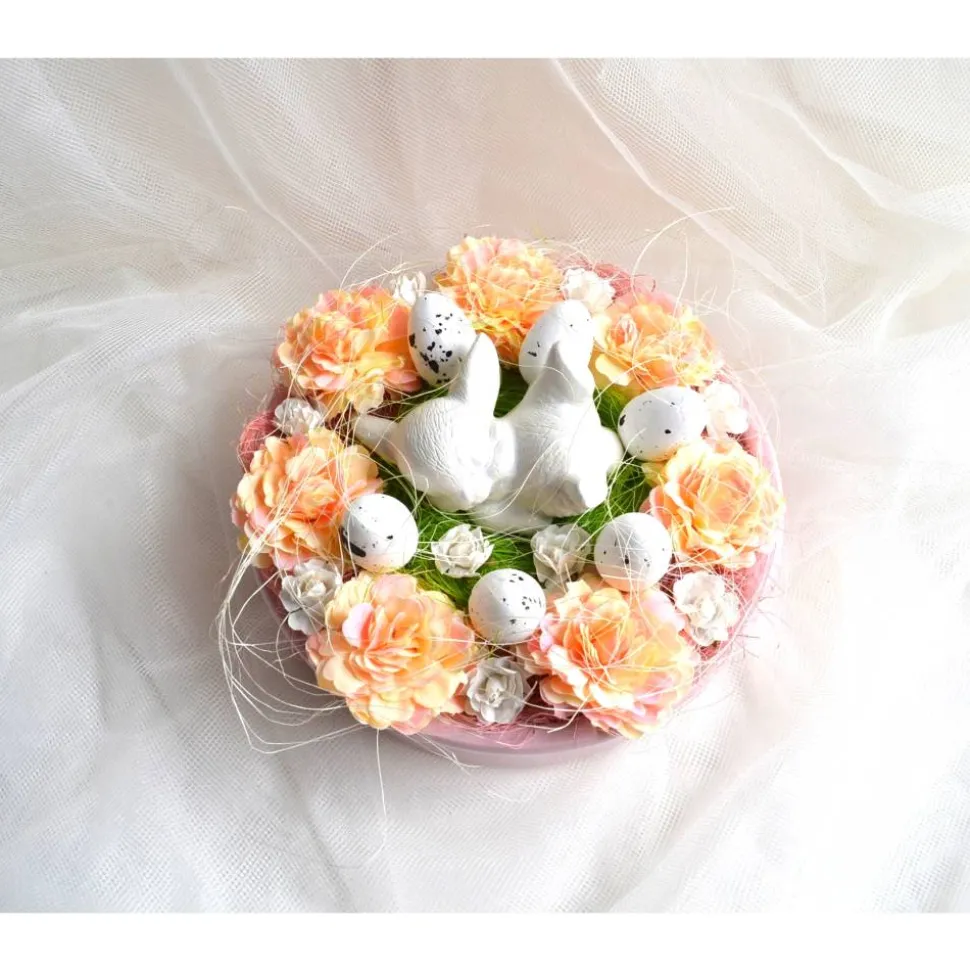 Dieses Ostergesteck in rosa-lachs-weiß ist eine gelungene Osterdekoration. Dafür bedarf es immer wieder neue Darsteller wie dieser niedliche Keramikhase, der sich in seinem Blumenbett aus lachsfarbenen Begonien und kleinen weißen Rosen sichtlich wohlfühlt. Ein originelles Dekostück, das in Ihrem Wohnambiente viel Wirkung entfaltet. Das Gesteck ist liebevoll in Handarbeit hergestellt. Ebenso wie der Keramikhase sind auch die Begonien von Hand gefertigt. Größe: Durchmesser ca. 19 cm, Höhe 5 cm.