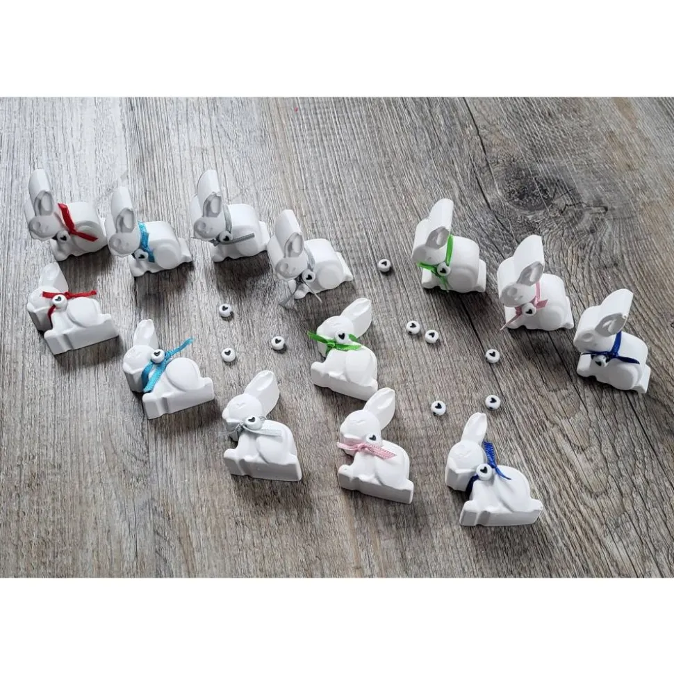 Die Häschen wurden mit verschieden farbigem Halsband und Herzchenperle versehen.