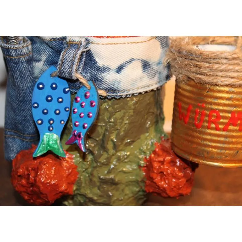 Das Haserl ist mit handbemalten Fischen aus Holz dekoriert. Auf der Rückseite ist die „Angelbeute“ angebracht, die der Fischer nicht so gerne angelt ;). Hier ist eine modellierte Konservendose und ein alter Schuh aus Ton am Jeansgürtel angebracht.