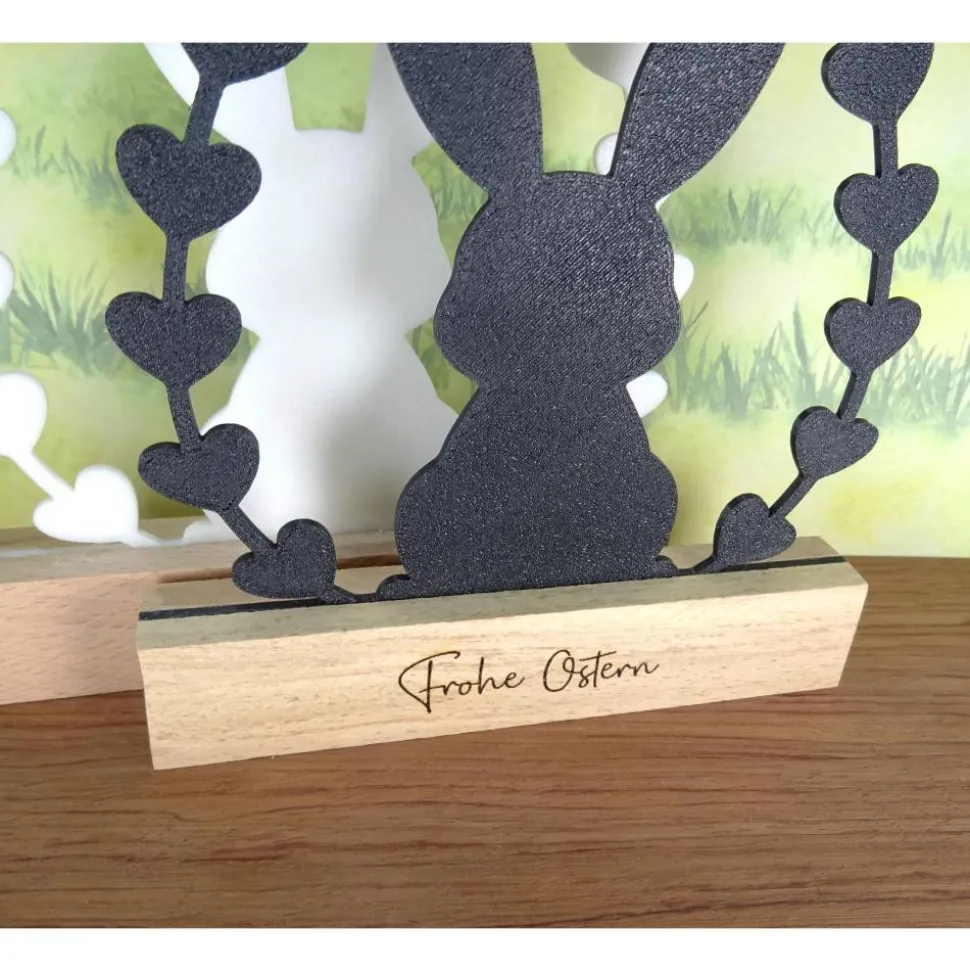 Die Häschen sind in einem Kranz mit Herzchen. Zur Auswahl schwarz oder weiß, in 3D-Druck erstellt.