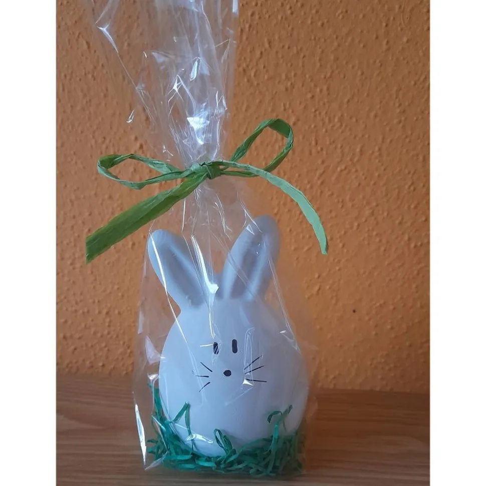 Auf Wunsch male ich ein Gesicht auf und verpacke Euch den Hasen in eine kleine Tüte mit Ostergras.
