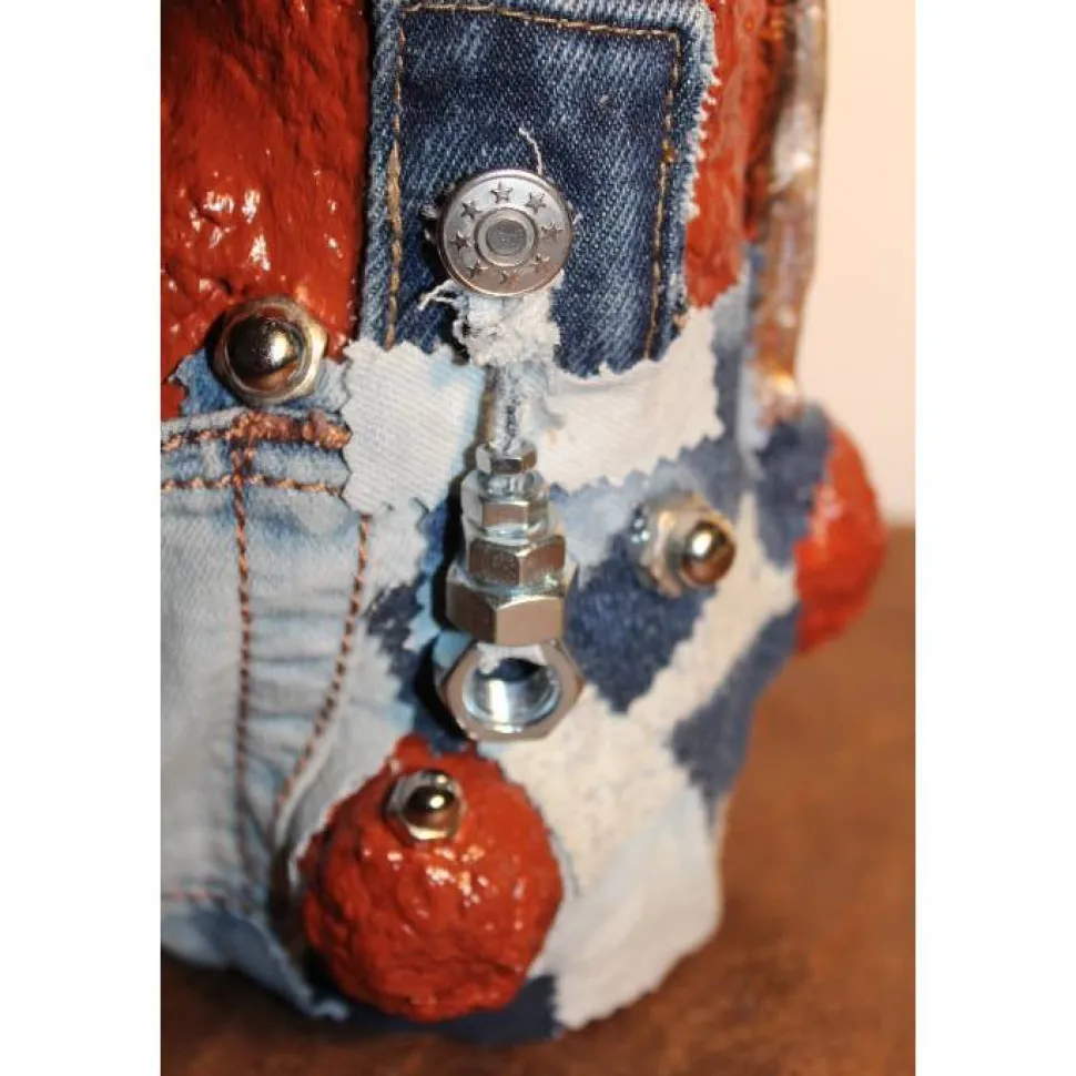 Witziges Upcycling-Projekt aus einer Glasflasche, gestaltet mit, Altpapier, Metallelementen, Jeansstoff, Modelliermasse und Acrylfarbe. Nette Künstlerfigur der etwas anderen Art aus upgecycelten Materialien.