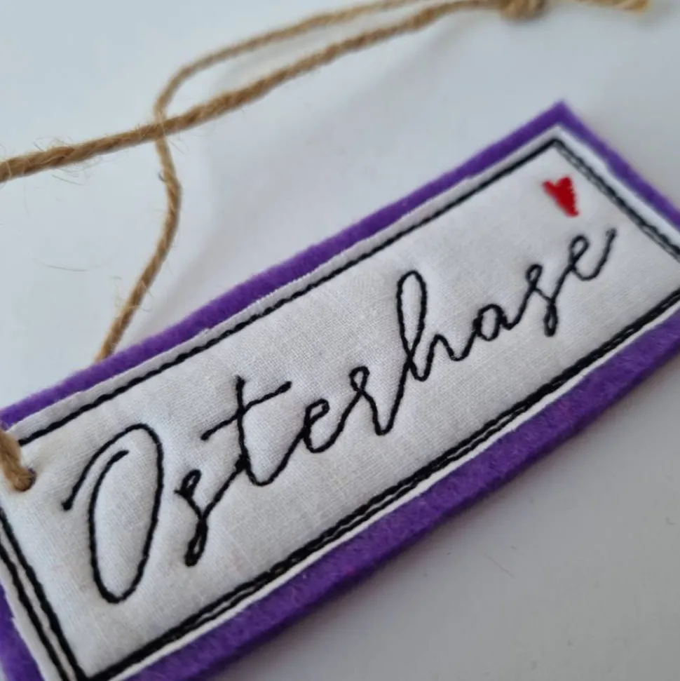 Der weiße Vintage-Stoff stammt aus den 60er Jahren und war in seinem Vorleben Teil einer edlen Aussteuer-Bettwäsche. Er ist in der sog. „Linon-Webart“ hergestellt worden und erinnert daher mit seiner leichten Struktur an einen Leinen-Stoff. Er wurde grob ausgeschnitten und passt so perfekt zum gestickten Doodle-Stich, der die geschwungene Handschrift „Osterhase“ einrahmt. Der Baumwollstoff kann mit der Zeit etwas ausfransen, dies stellt keinen Makel dar, sondern ist ein gewünschter Effekt des angesagten „Patina-Look“.